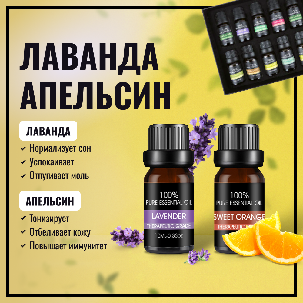 Набор эфирных масел (6шт) лаванды, чайного дерева, апельсина, мелиссы, эвкалипта, бергамота. Эфирное масло для диффузора, увлажнителя, аромалампы
