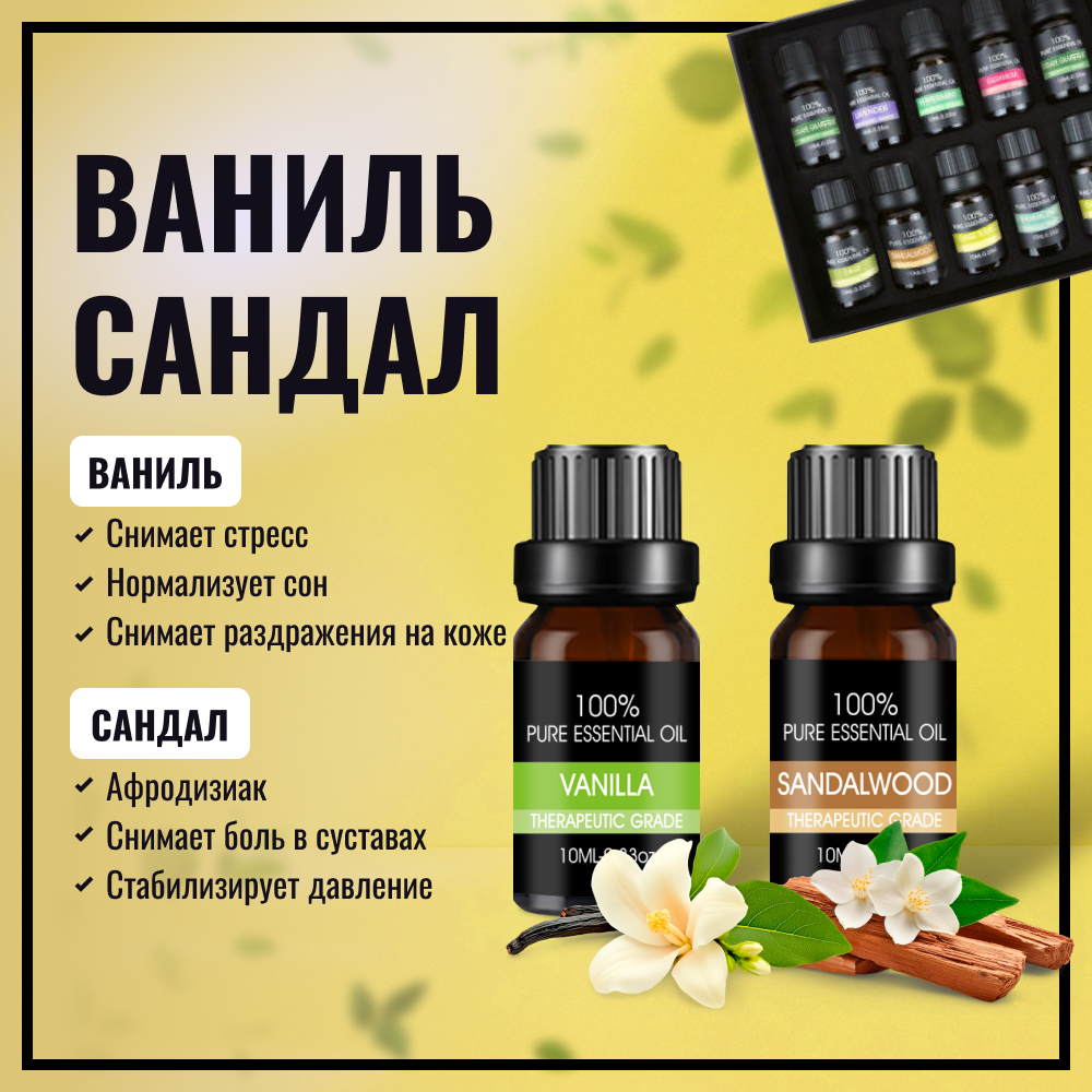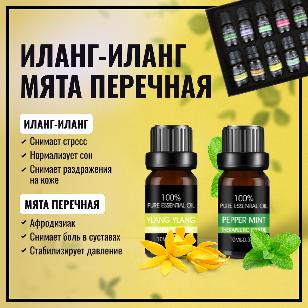 Набор (12 шт) эфирных масел: мяты, лаванды, чайного дерева, пачули, иланг-иланг, сладкого апельсина, сосны, эвкалипта, розы, сандала, герани, ванили