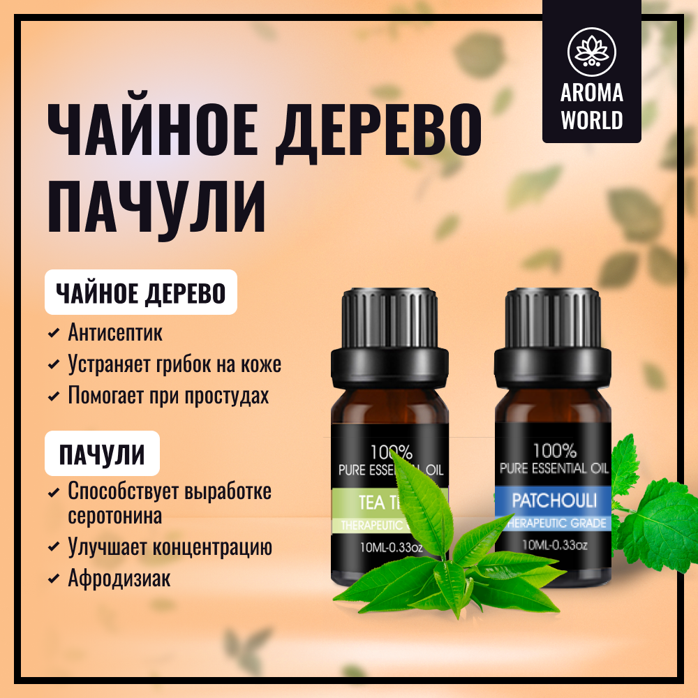 Набор эфирных масел, 6 шт в наборе. Эфирное масло мяты перечной, лаванды, чайного дерева, пачули, иланг-иланг, апельсина