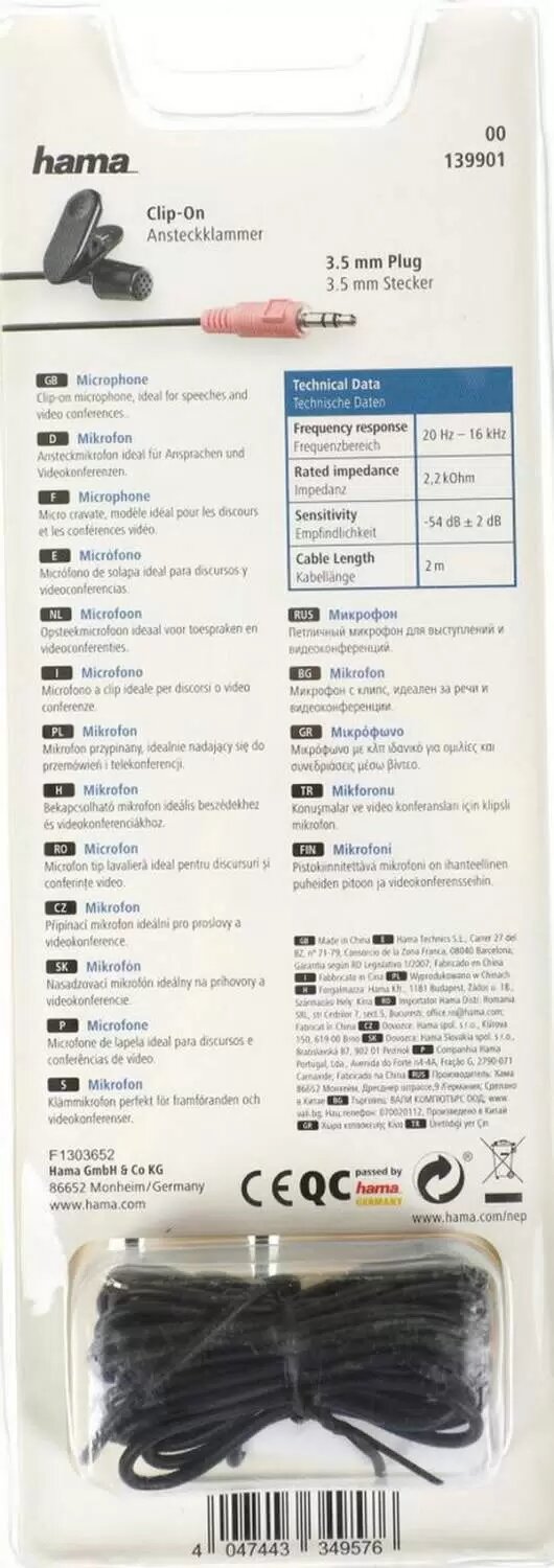 Микрофон проводной HAMA Clip-On (00139901), разъем: mini jack 3.5 mm
