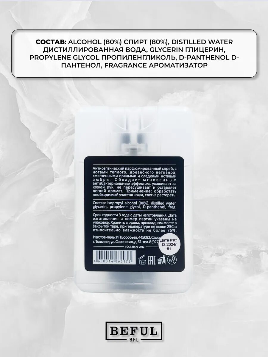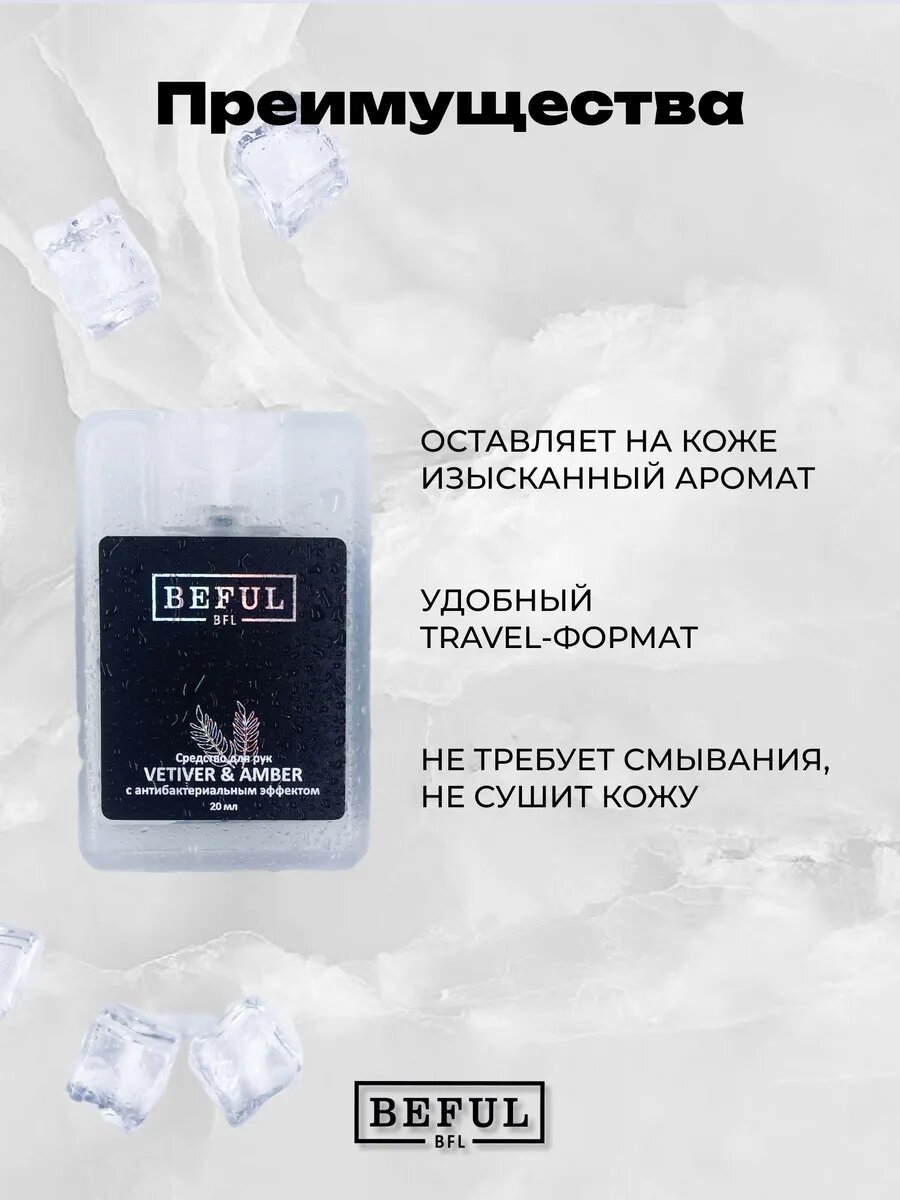 Карманный антисептик для рук BEFUL "VETIVER&AMBER" с D пантенолом, 20мл, парфюмированный санитайзер