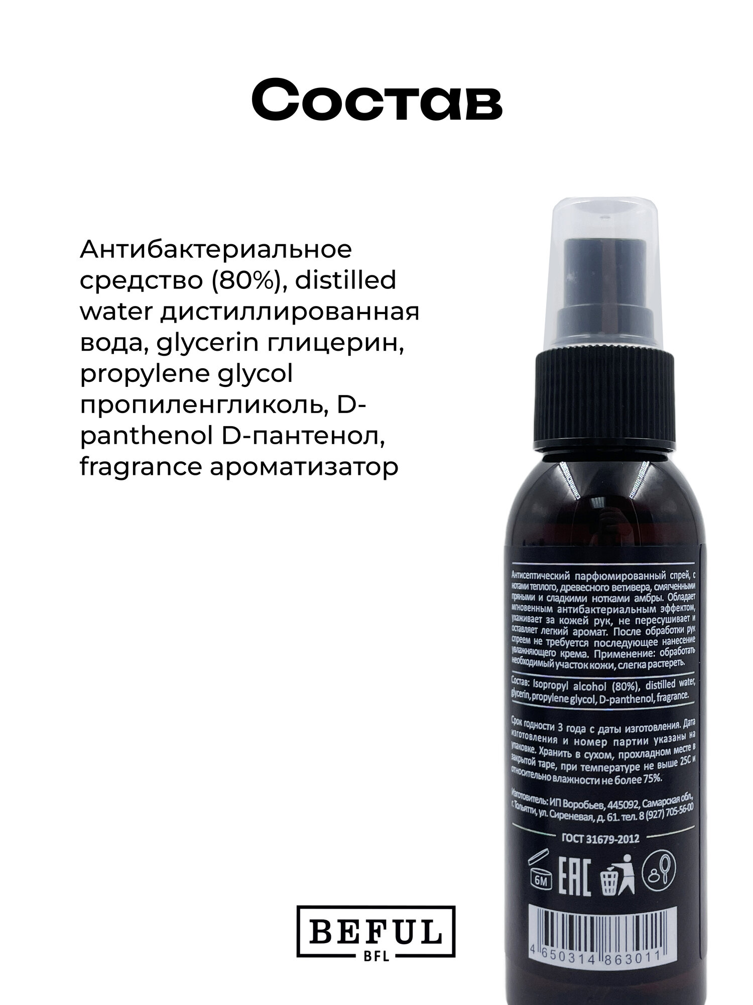 Карманный антисептик для рук BEFUL "VETIVER&AMBER" с D пантенолом, 20мл, парфюмированный санитайзер