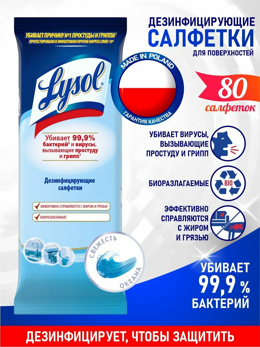 Купить Lysol Дезинфицирующие салфетки Свежесть океана, 80 шт