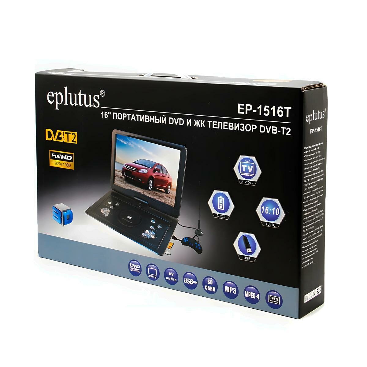Портативный DVD плеер DVB-T2 16 дюймов Eplutus EP-1516T(TFT ЖК) (K5850RU), переносной DVD с телевизором. Диагональ экрана, в дюймах 16. интересное: