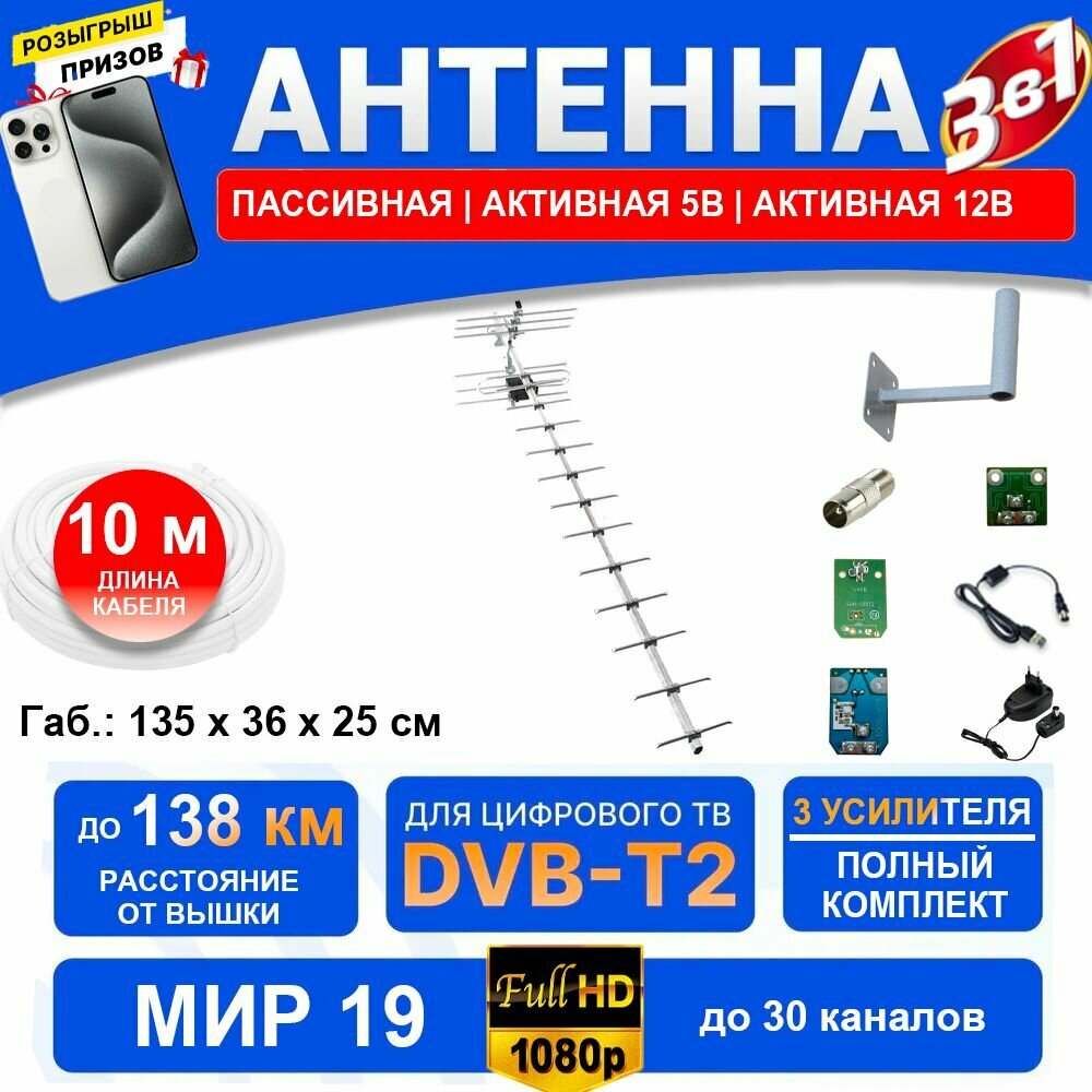 Купить МИР 19 (3 в 1 полный комплект до 138 км) Антенна для приема цифровых каналов, штекер, 5В и 12В усилитель, инжектор блок питания кронштейн кабель