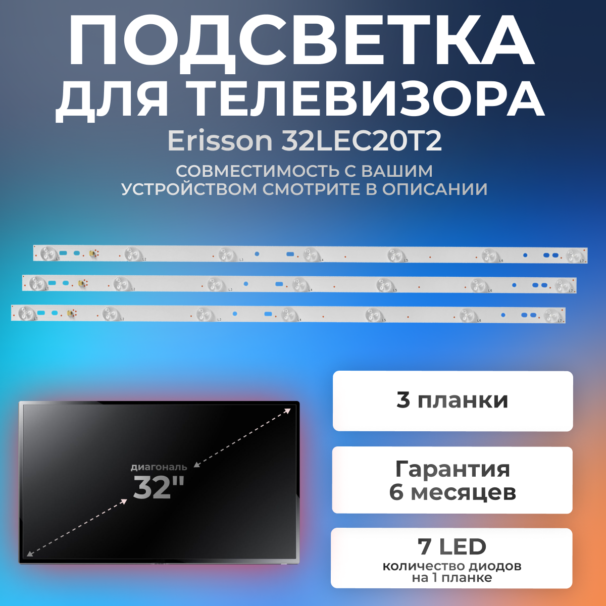 Подсветка для Erisson 32LEC20T2, SL-MH3150AS-0701-02, 2201-MH31528-0701SV4 / 32" 3V 7 led (комплект 3 шт) 590mm интересное:
