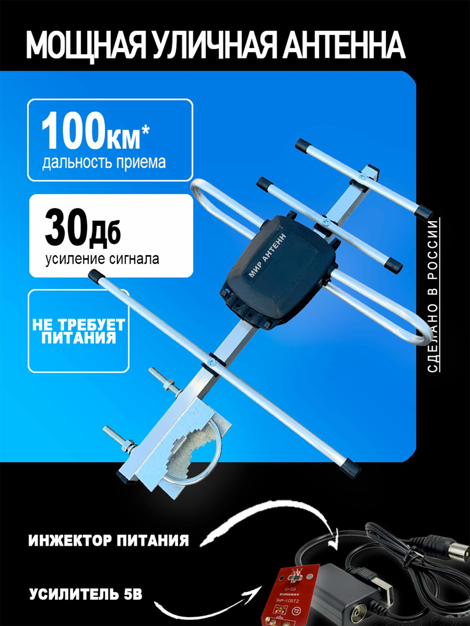 Антенна уличная для цифрового ТВ МИР-50 с усилителем (DVB-T2, 5В) комплект: кабель, кронштейн, инжектор