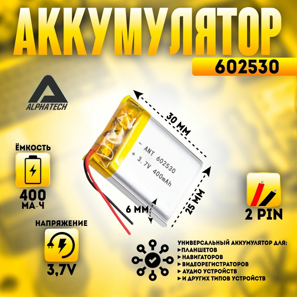 Аккумулятор (батарея) универсальный, Li-Pol, 602530, 6*25*30мм, 2pin, 3.7V/400mAh интересное: