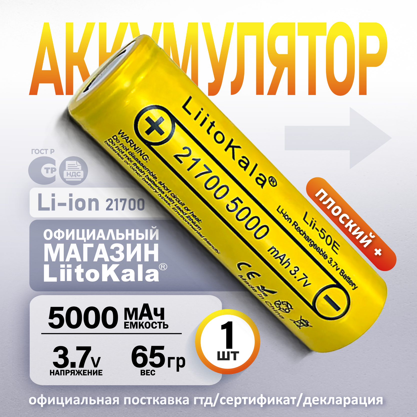 Аккумулятор LiitoKala 21700 Lii-50E Li-Ion 3.7В 5000mAh, в упаковке: 1 шт. интересное: