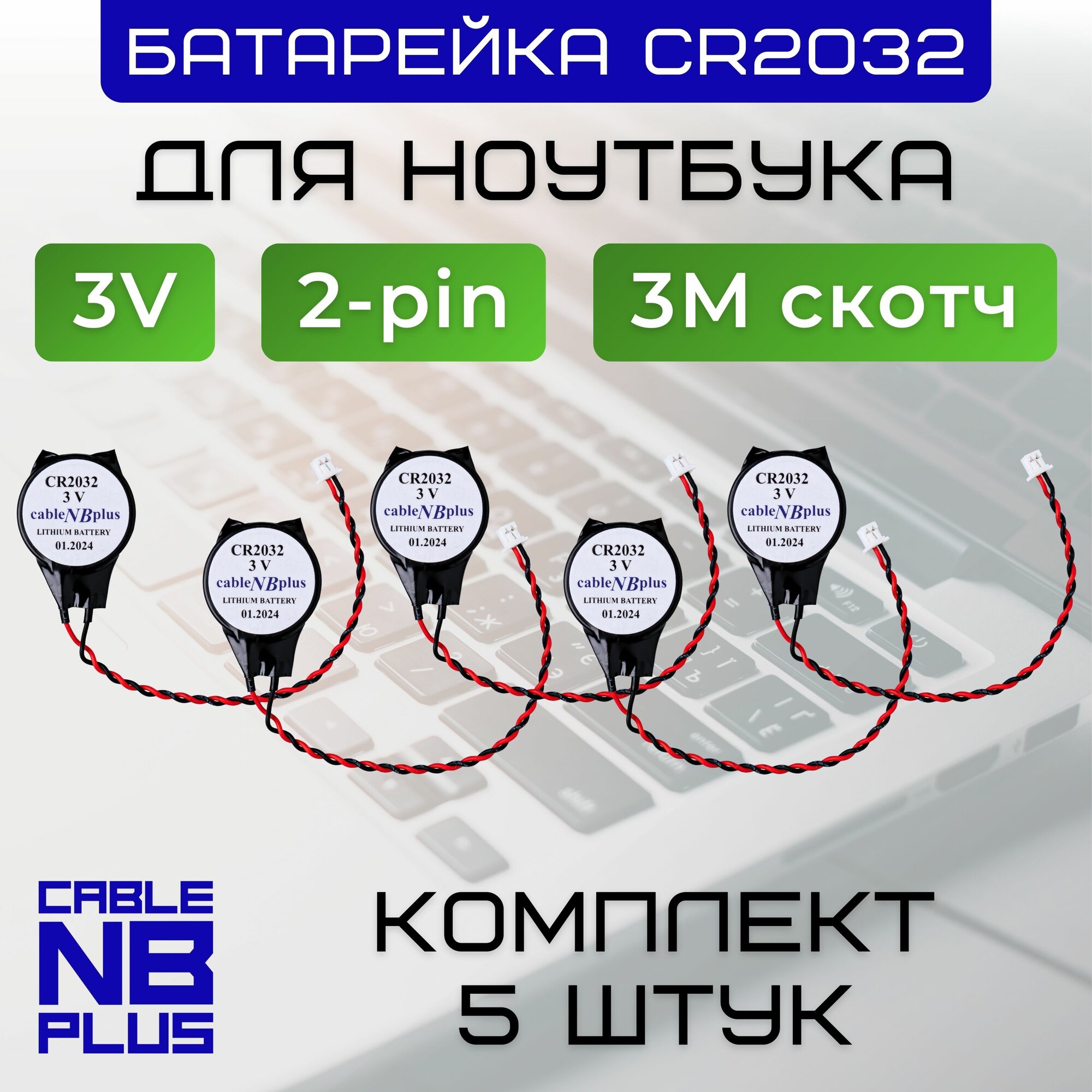 Купить Батарейка с разъемом 2pin (Комплект- 5шт.) с 3M скотчем CMOS CR2032, для биоса (BIOS) ноутбуков