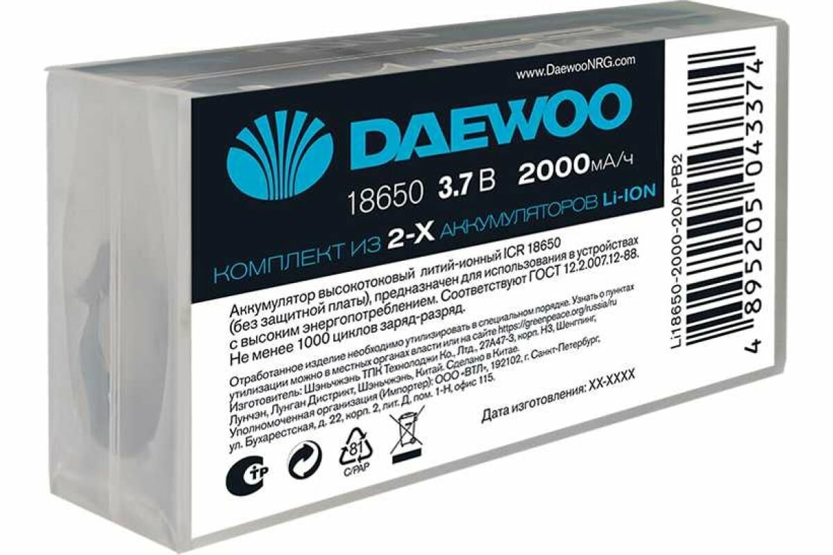 Комплект литий-ионных аккумуляторов Daewoo 18650 2000мАч 20А 2 шт. интересное:
