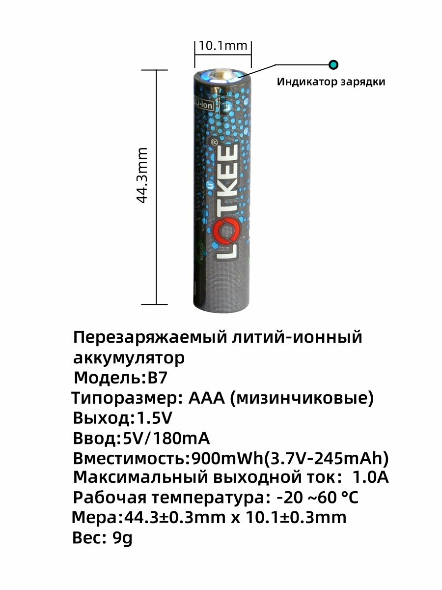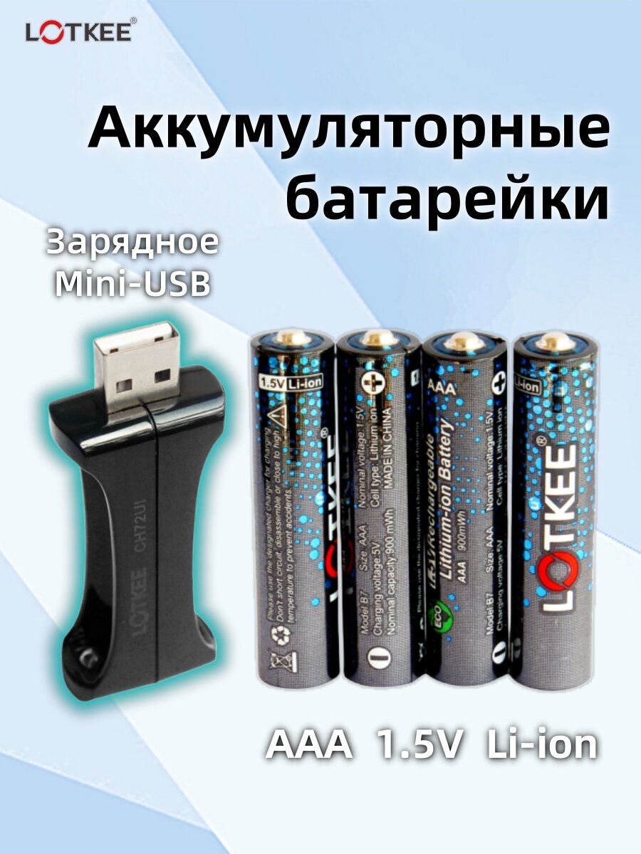 АAА Аккумуляторные батарейки LOTKEE 900 mWh, Li ion, Мизинчиковые 1.5V 4 шт, С USB мини-зарядным устройством интересное:
