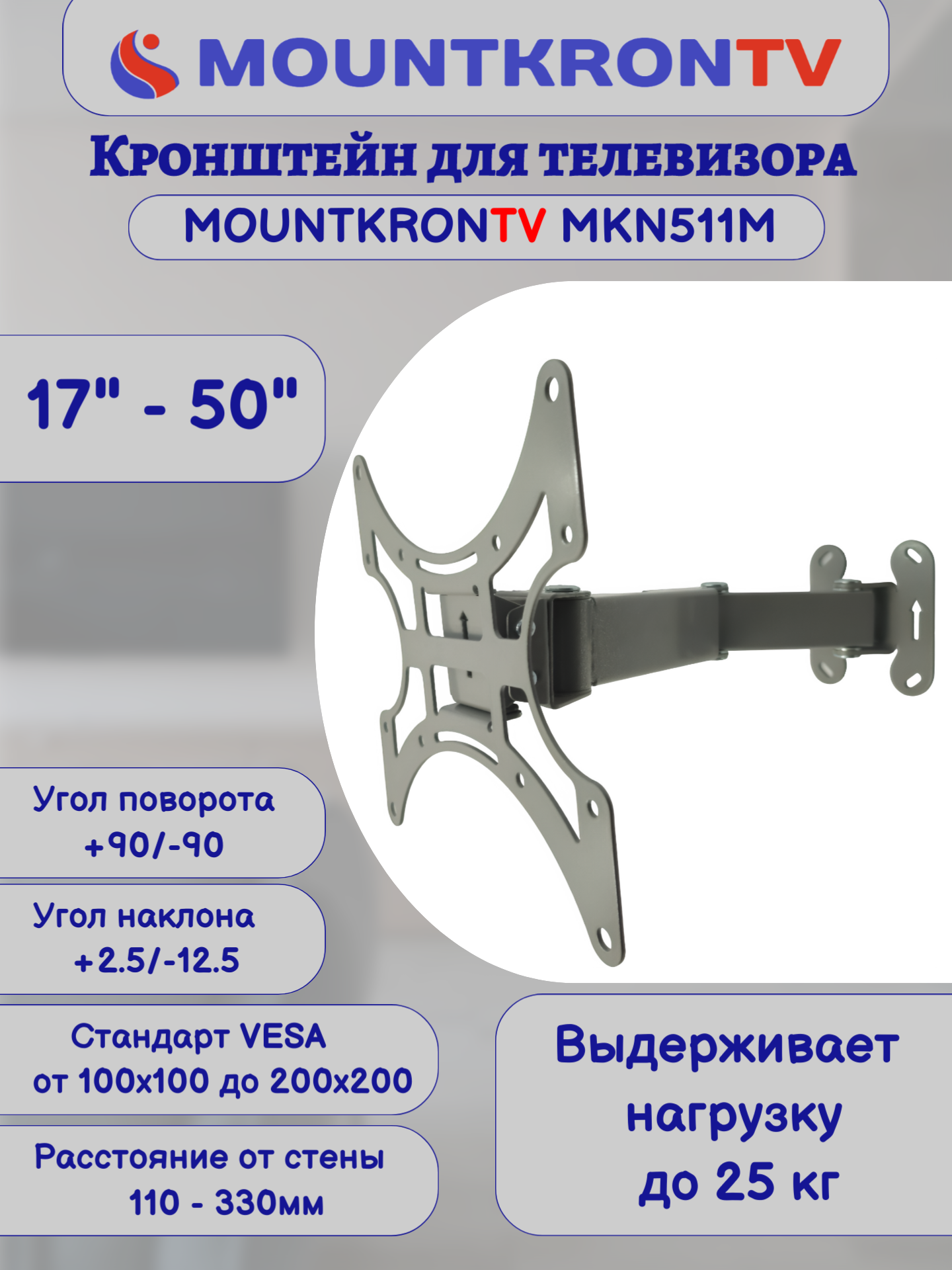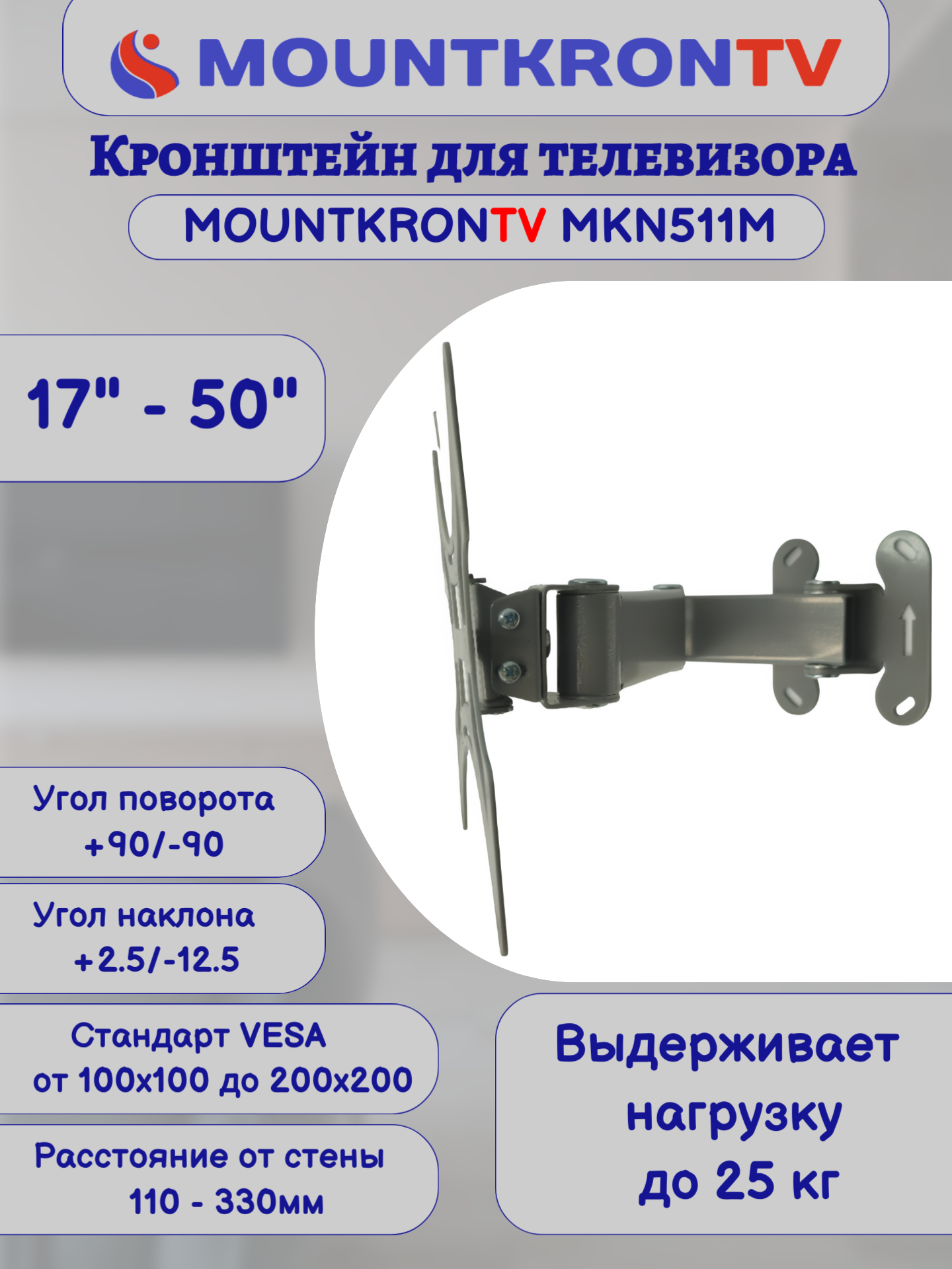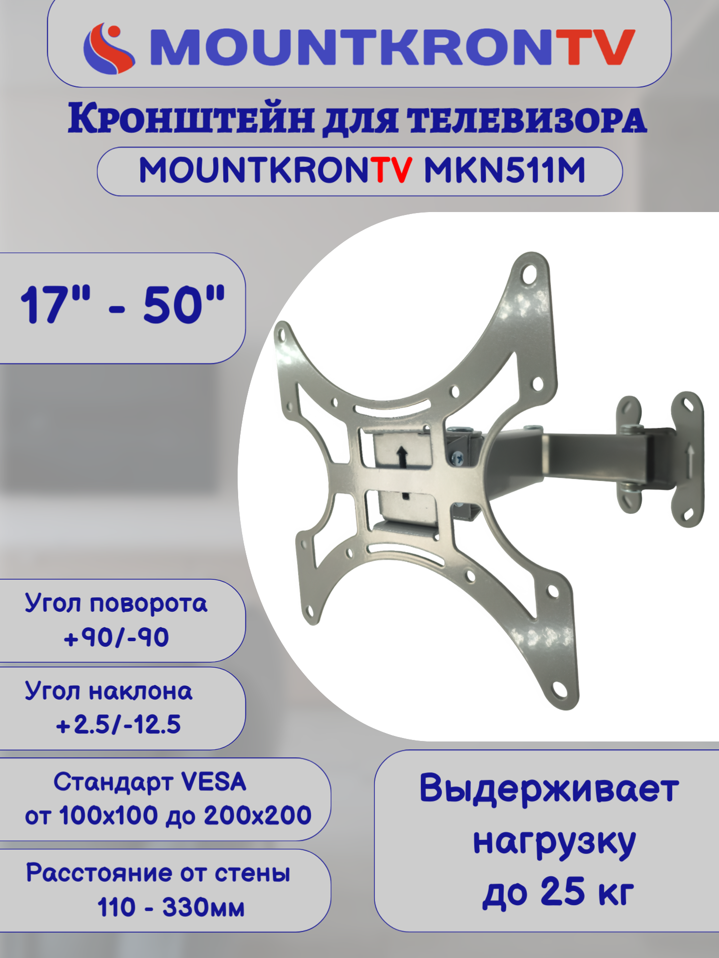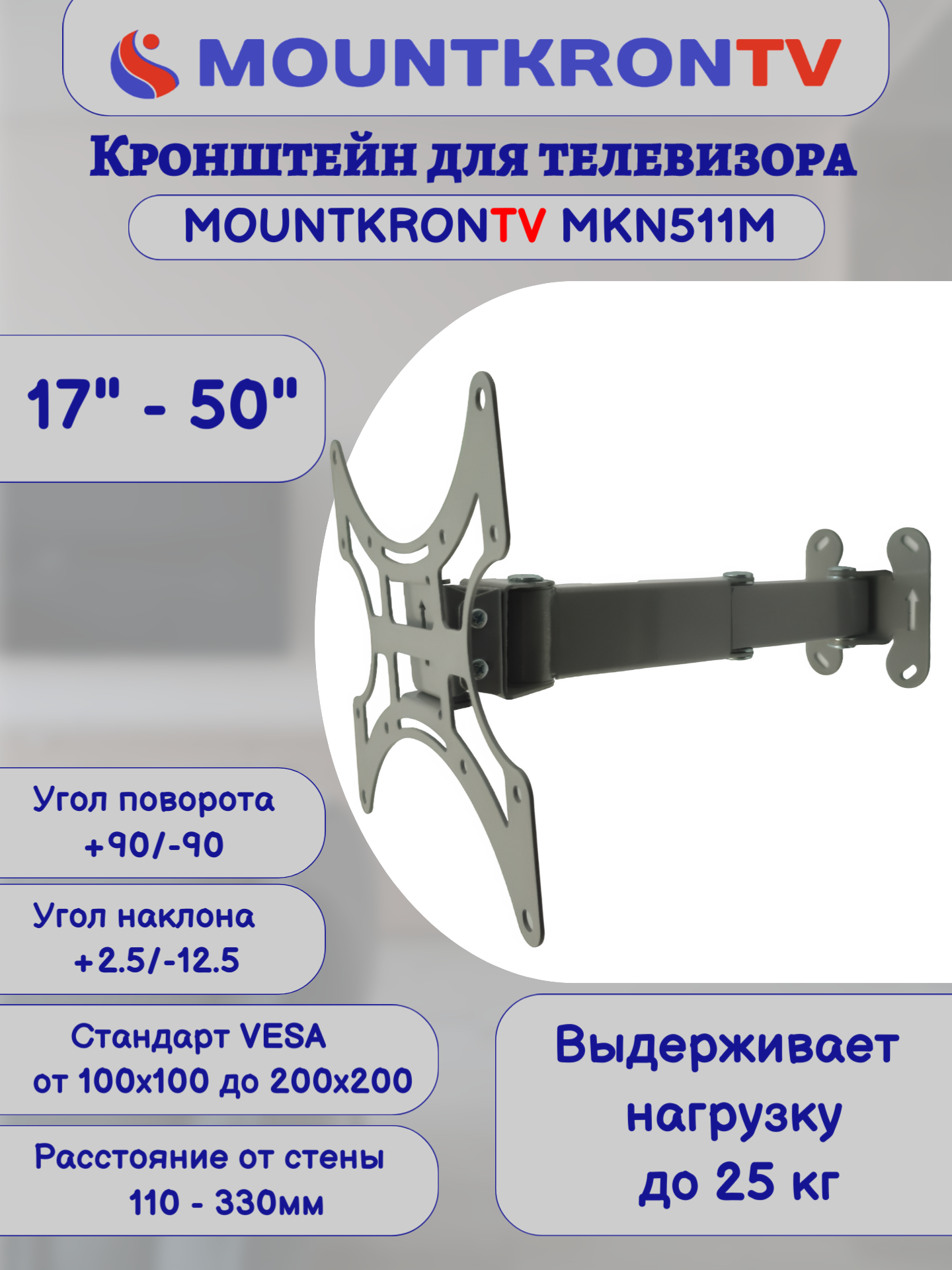 Кронштейн для телевизора MOUNTKRONTV MKN511M на стену, наклонно-поворотный, диагональ 17"-50", серый металлик интересное: