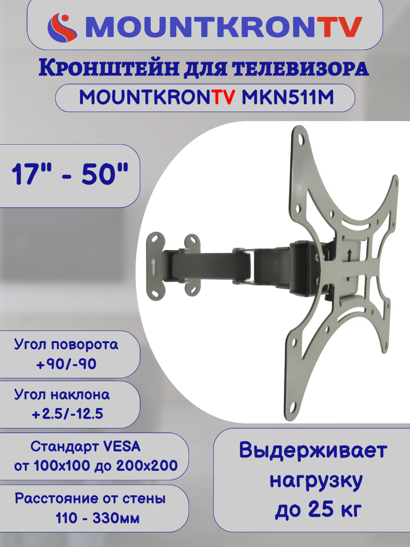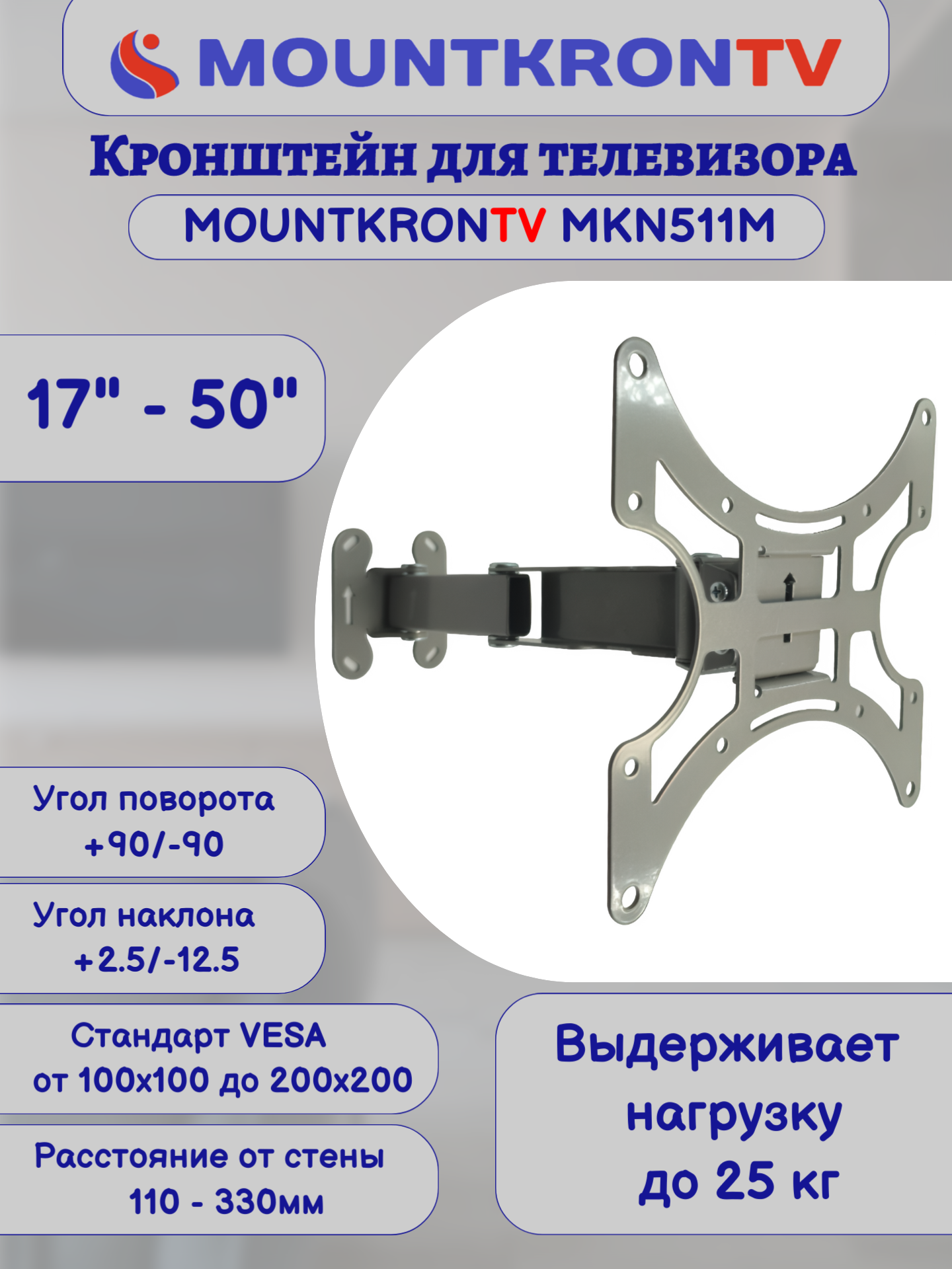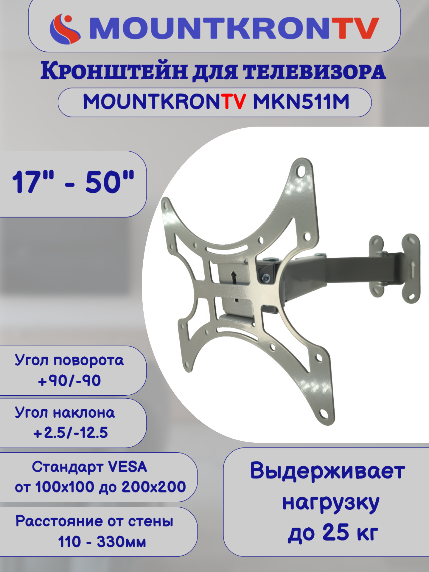 Кронштейн для телевизора MOUNTKRONTV MKN511M на стену, наклонно-поворотный, диагональ 17"-50", серый металлик интересное: