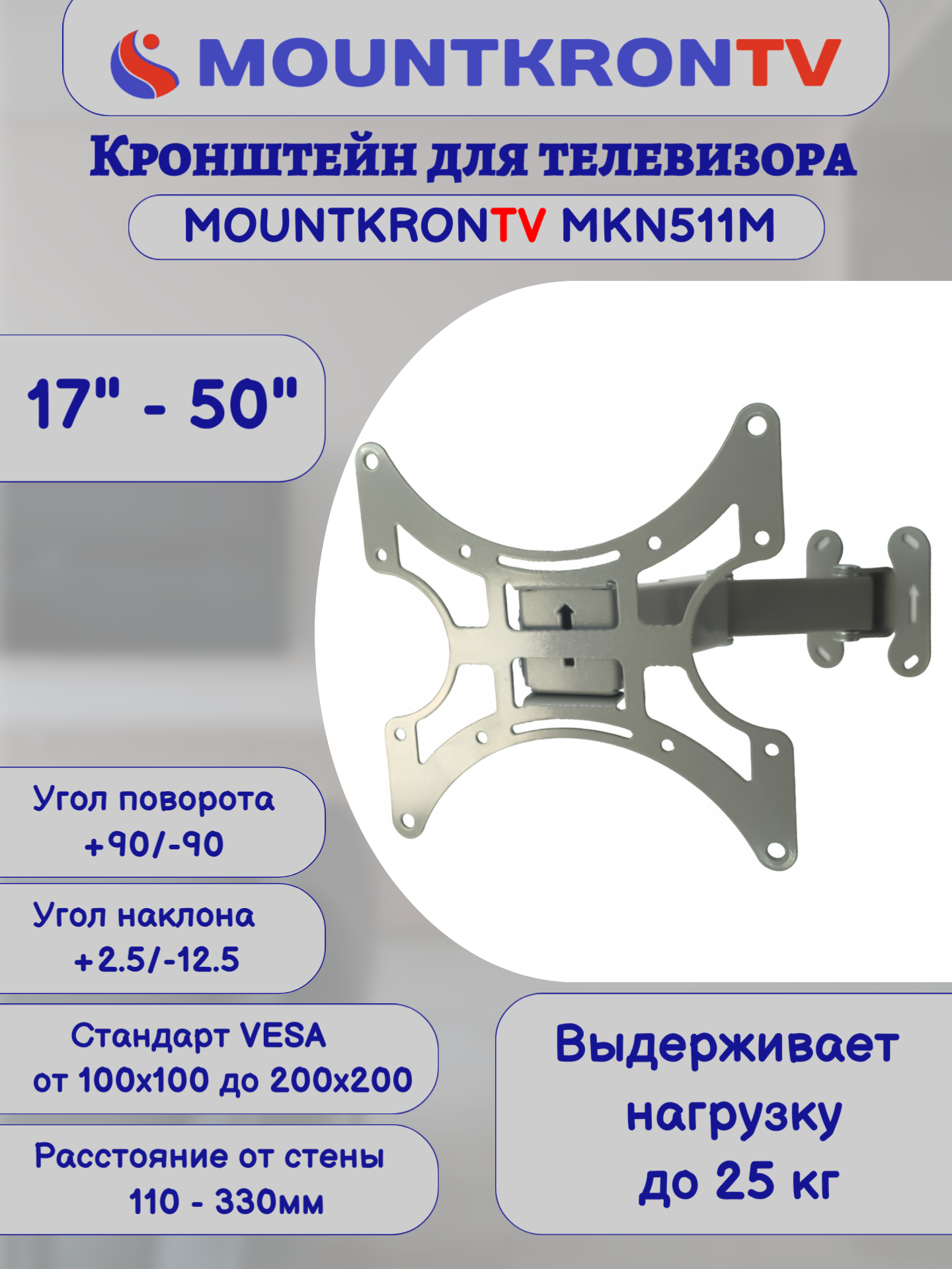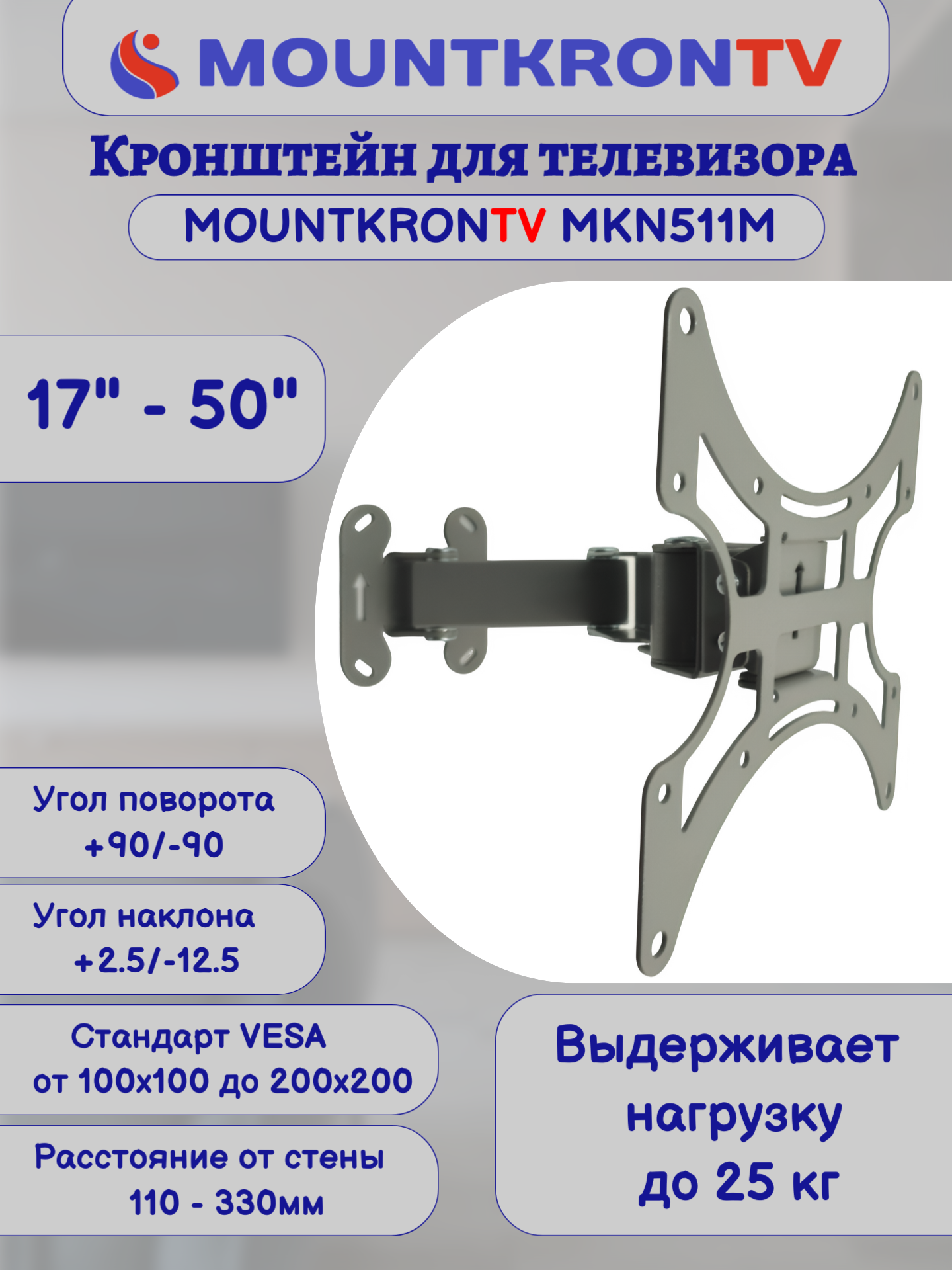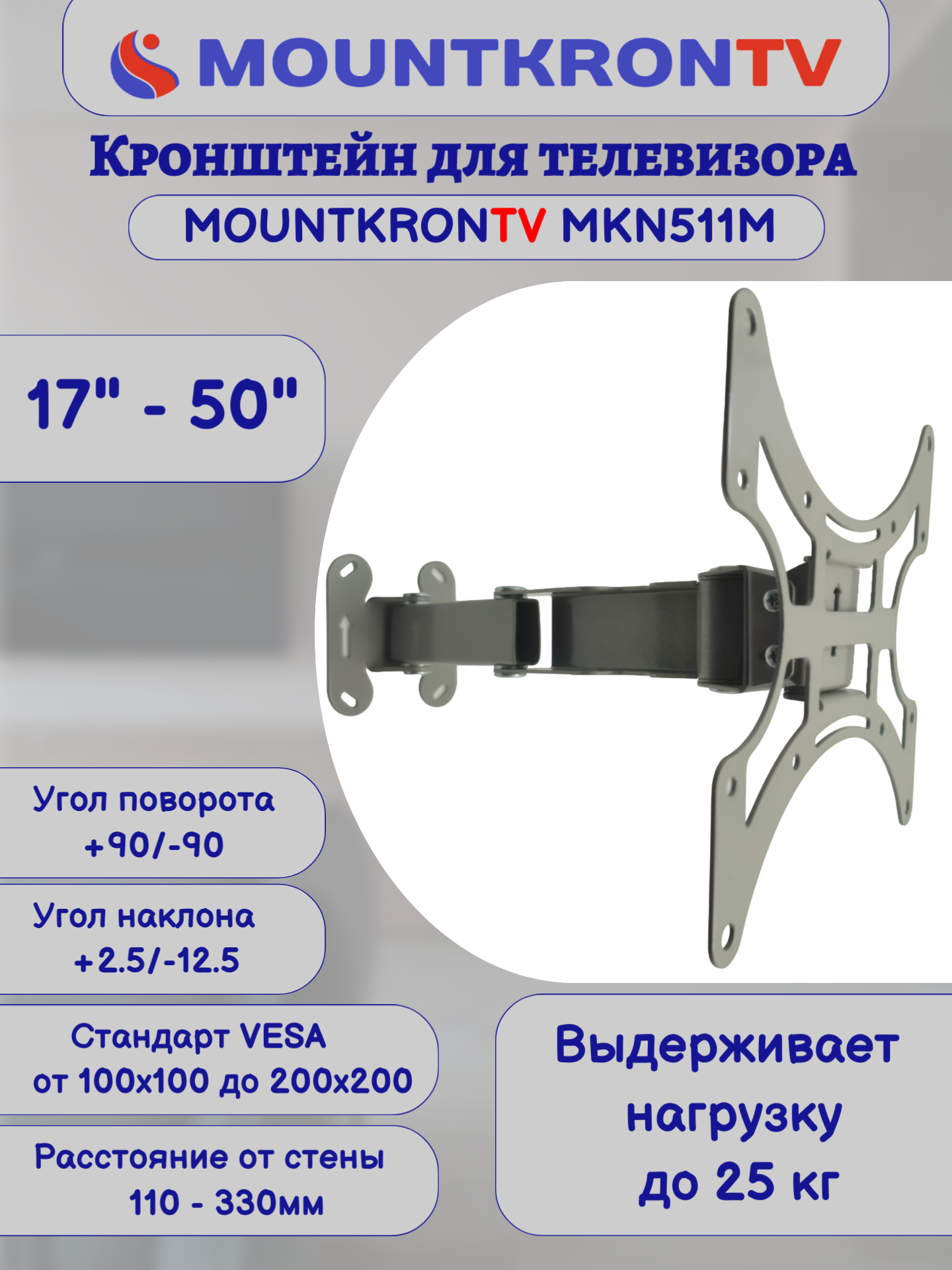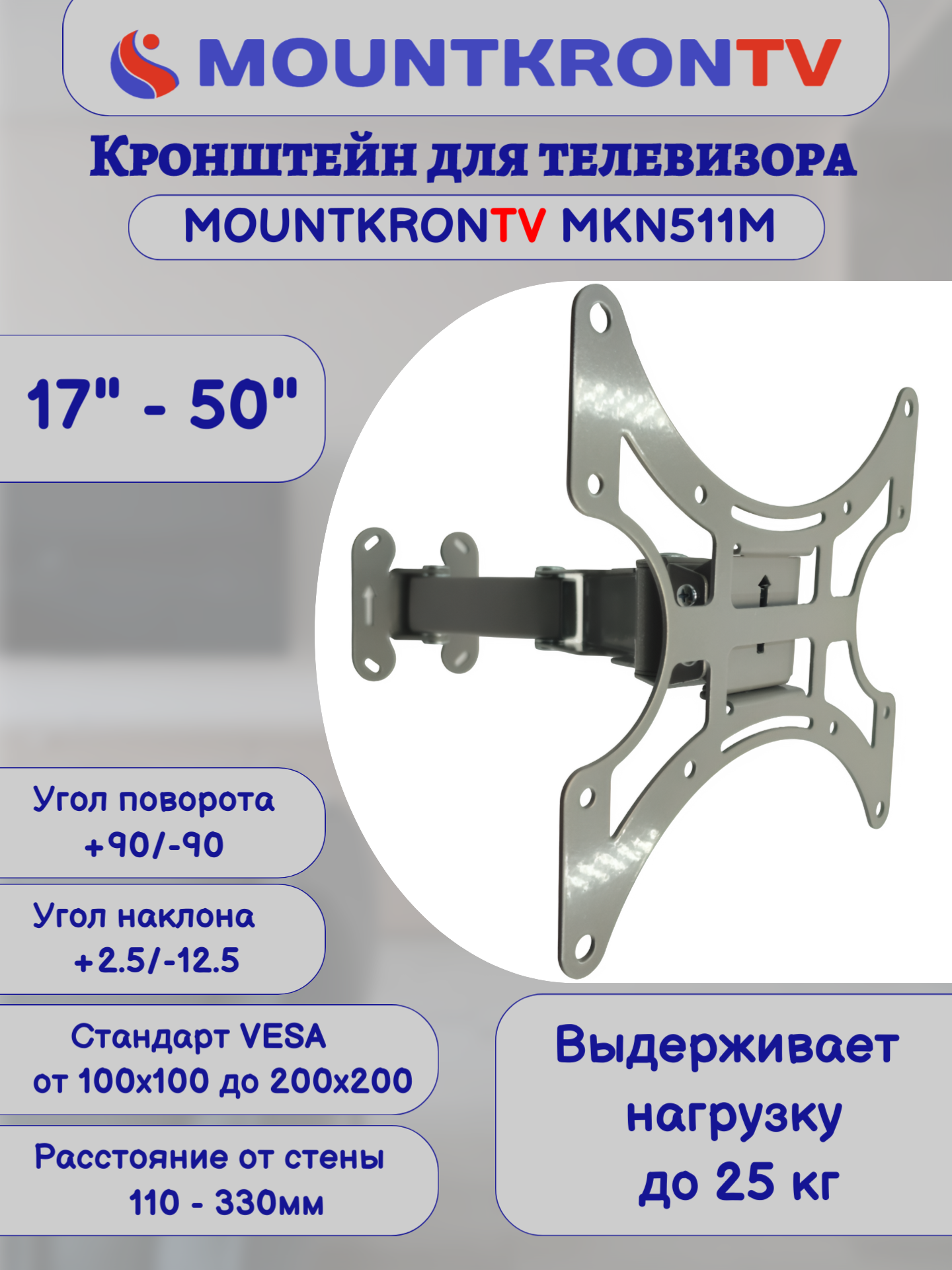 Кронштейн для телевизора MOUNTKRONTV MKN511M на стену, наклонно-поворотный, диагональ 17"-50", серый металлик интересное: