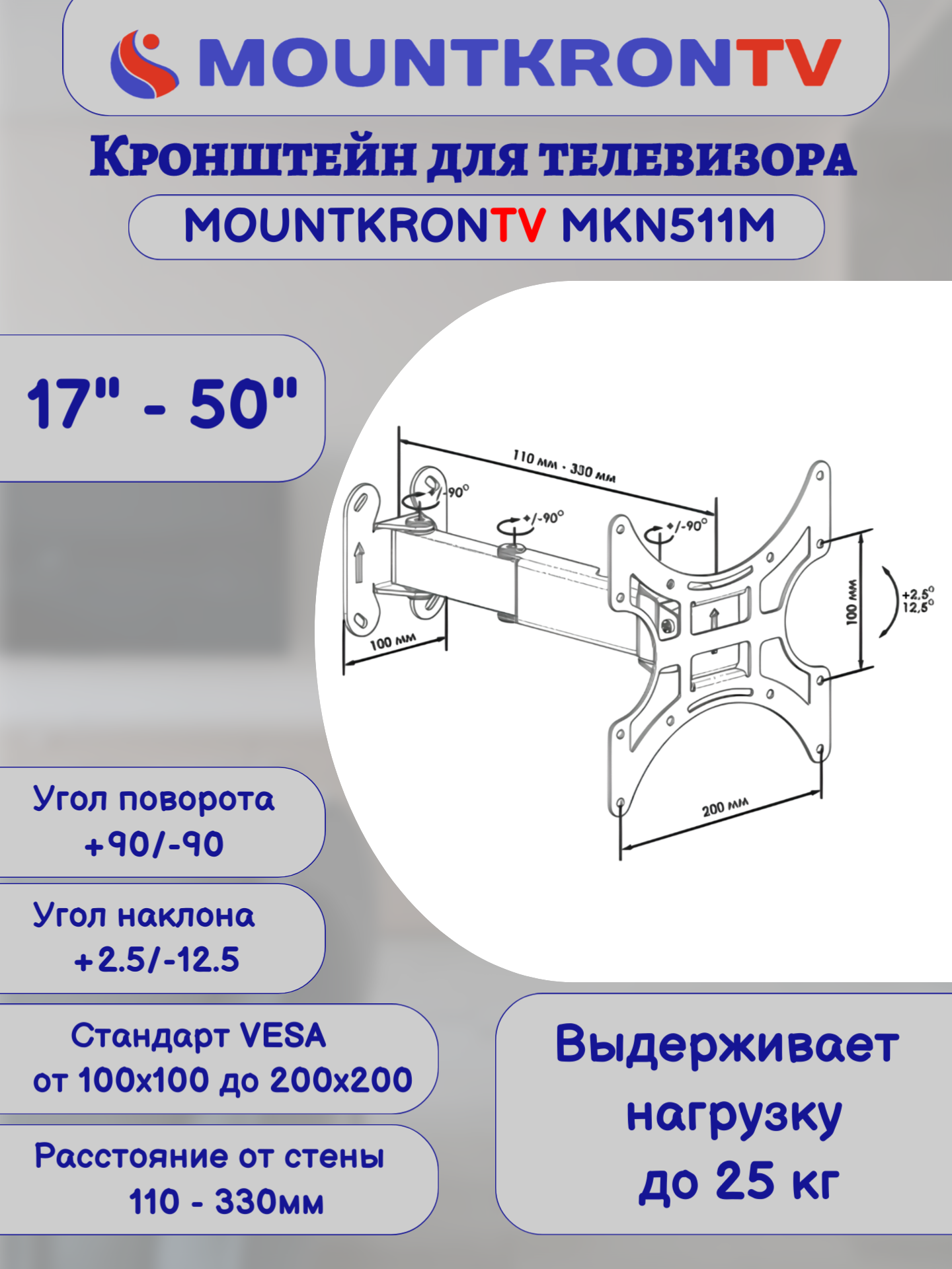 Кронштейн для телевизора MOUNTKRONTV MKN511B на стену, наклонно-поворотный, диагональ 17"-50", черный