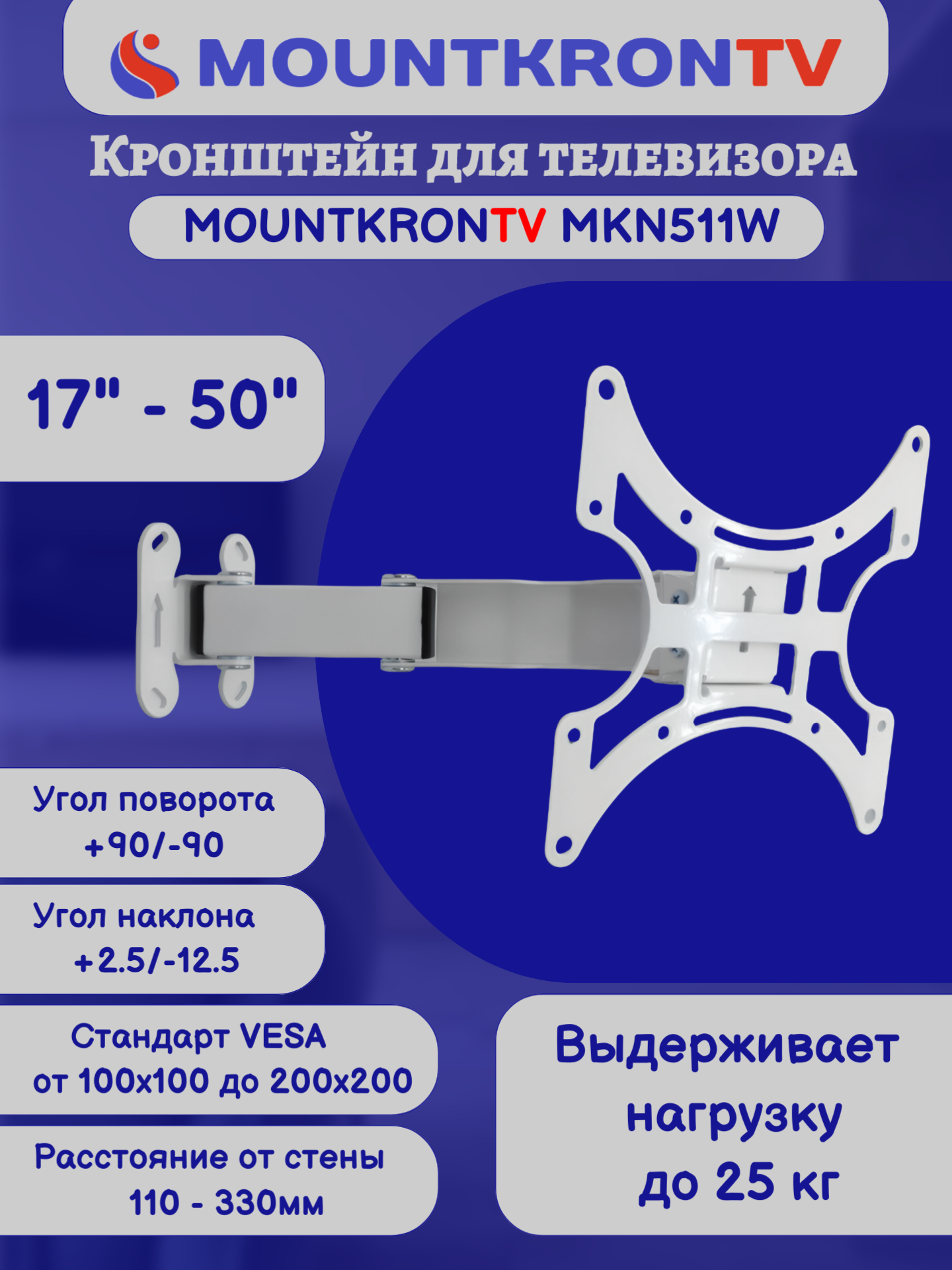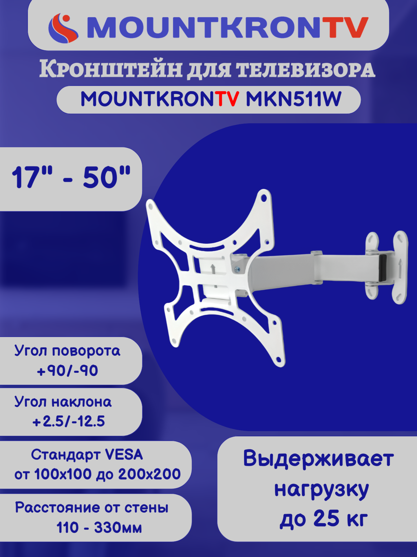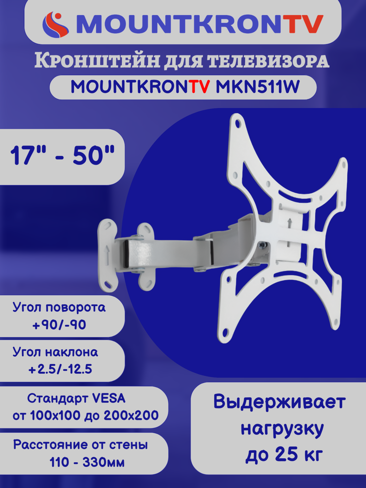 Кронштейн для телевизора MOUNTKRONTV MKN511W на стену, наклонно-поворотный, диагональ 17"-50, белый интересное: