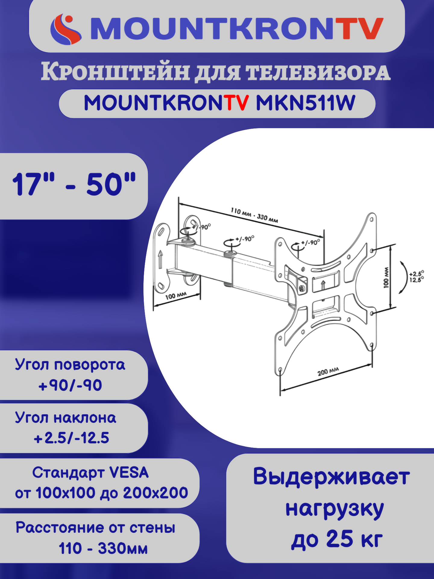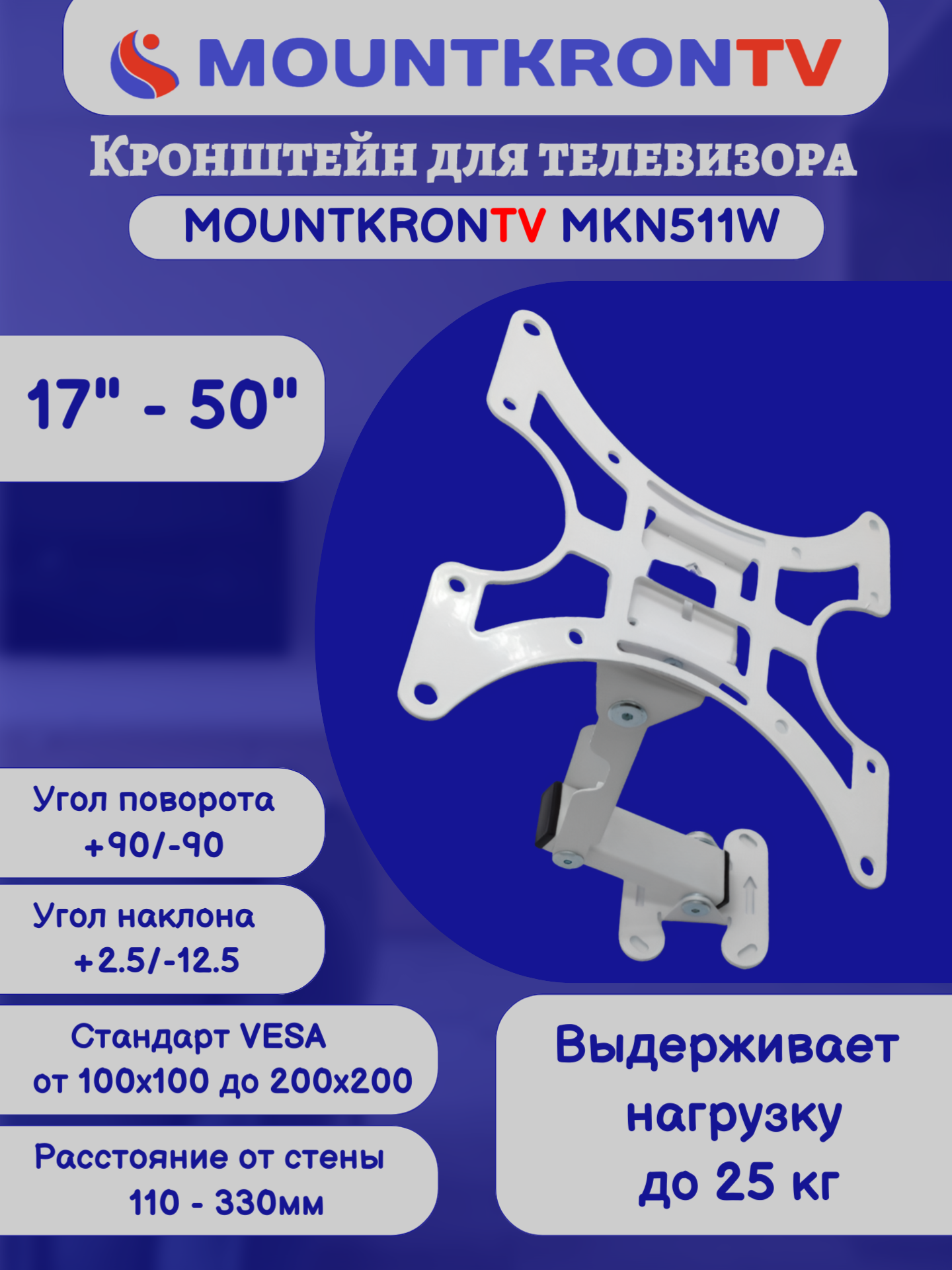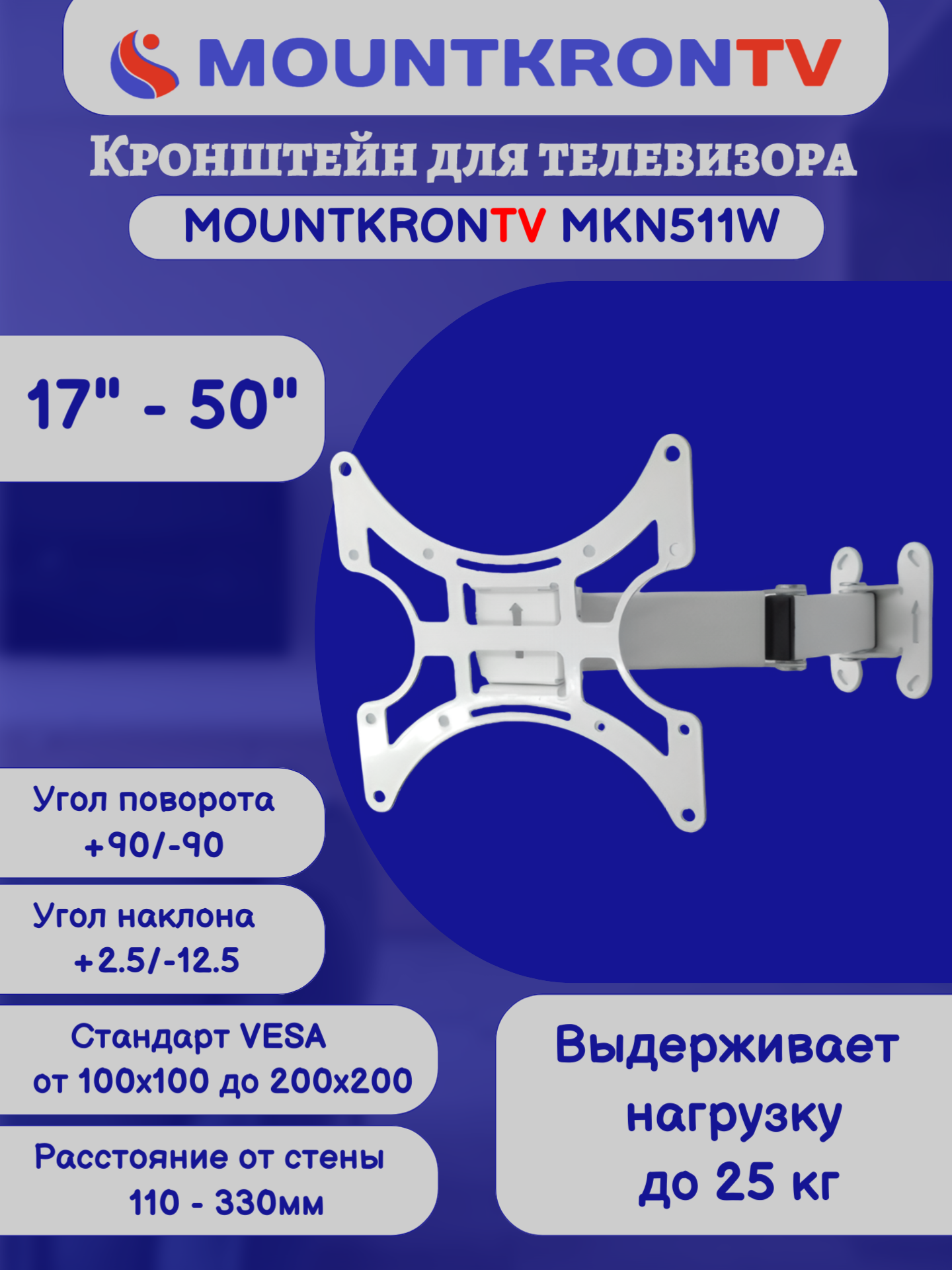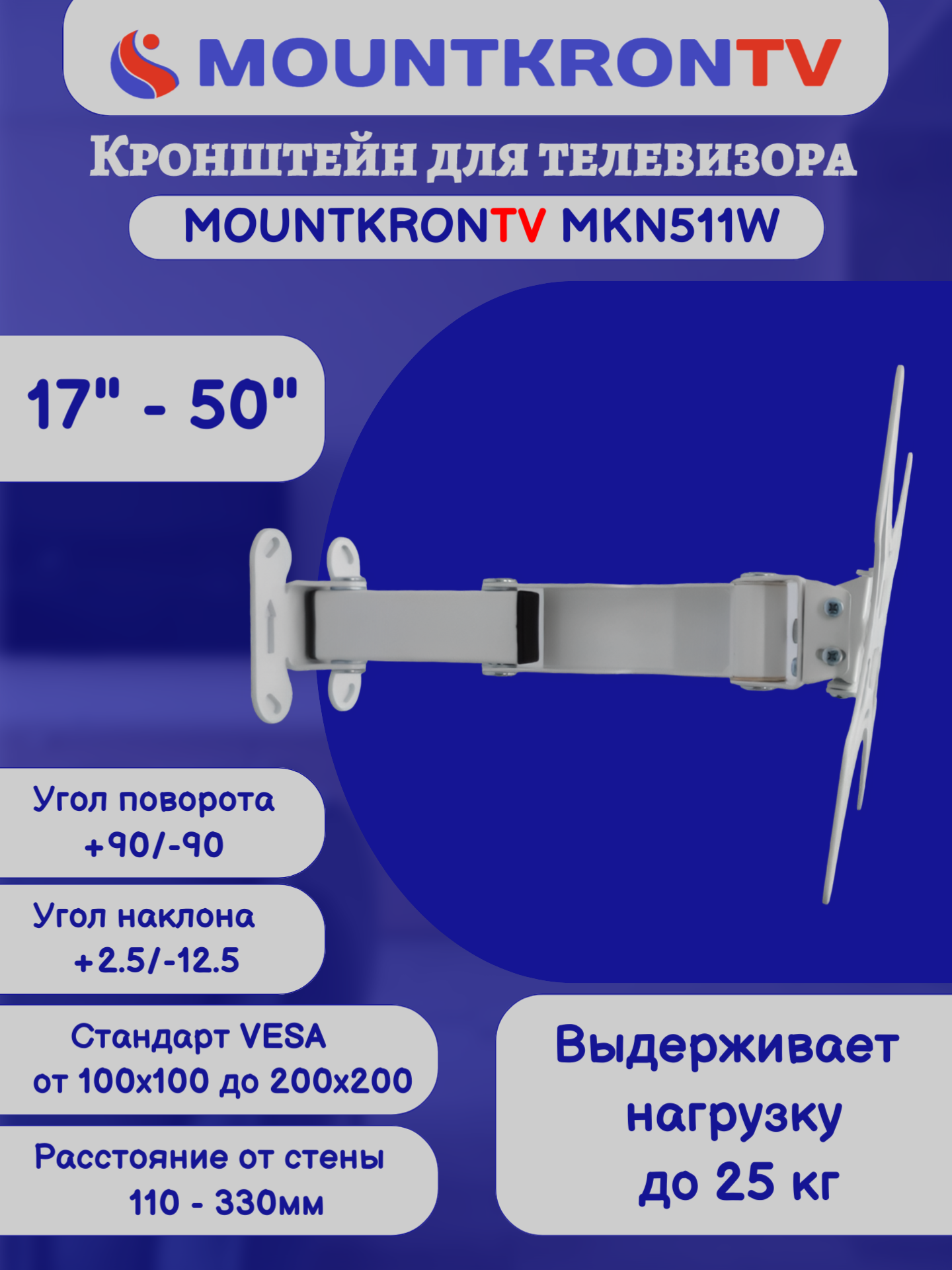 Кронштейн для телевизора MOUNTKRONTV MKN511W на стену, наклонно-поворотный, диагональ 17"-50, белый интересное: