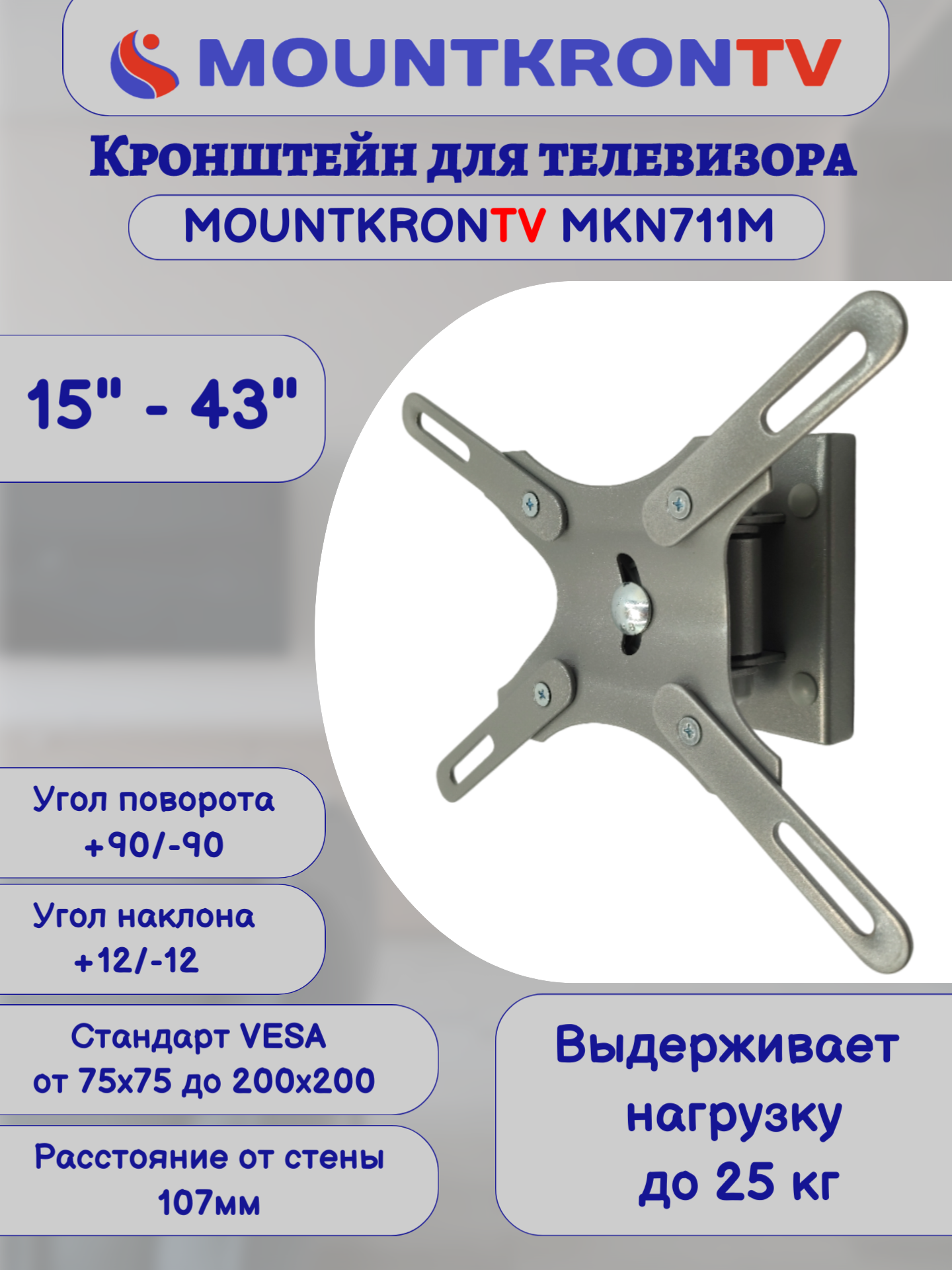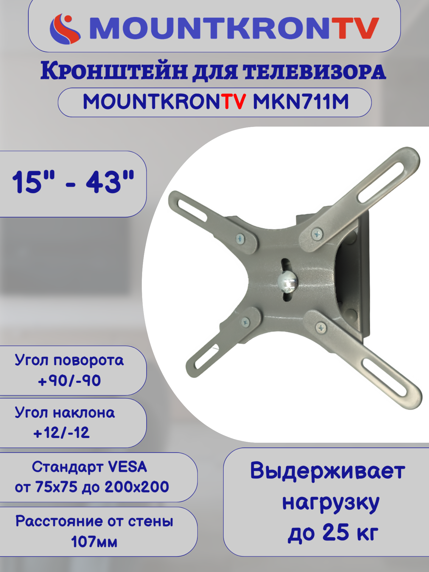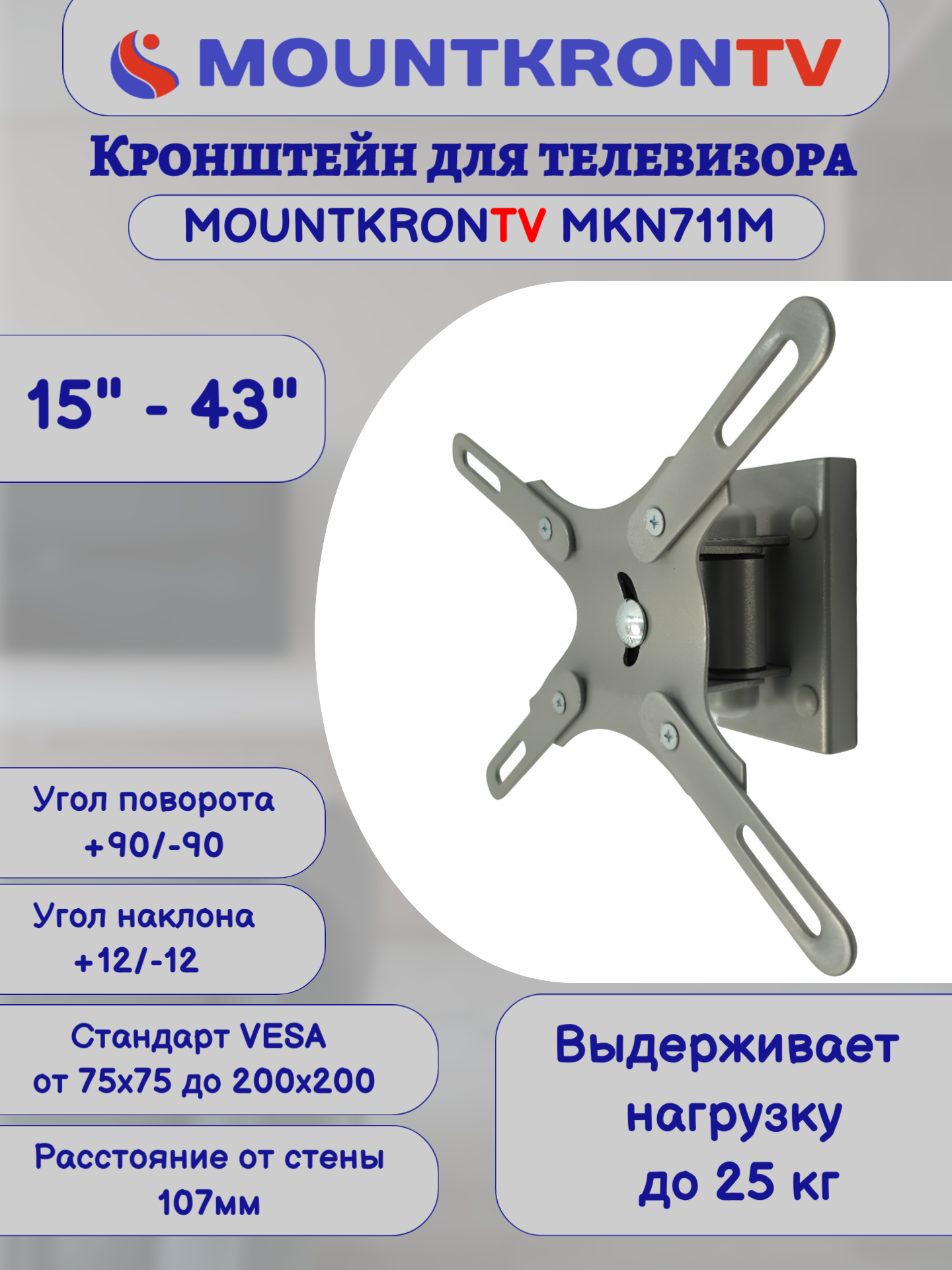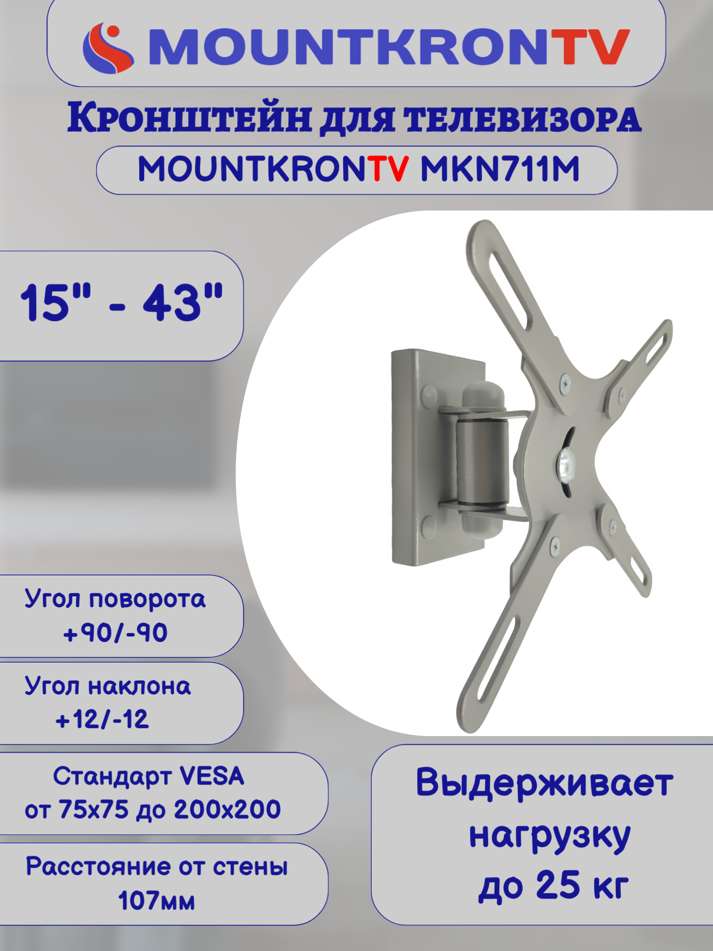 Кронштейн для телевизора MOUNTKRONTV MKN711M диагональ 15"-43", на стену, наклонно-поворотный, серый металлик интересное: