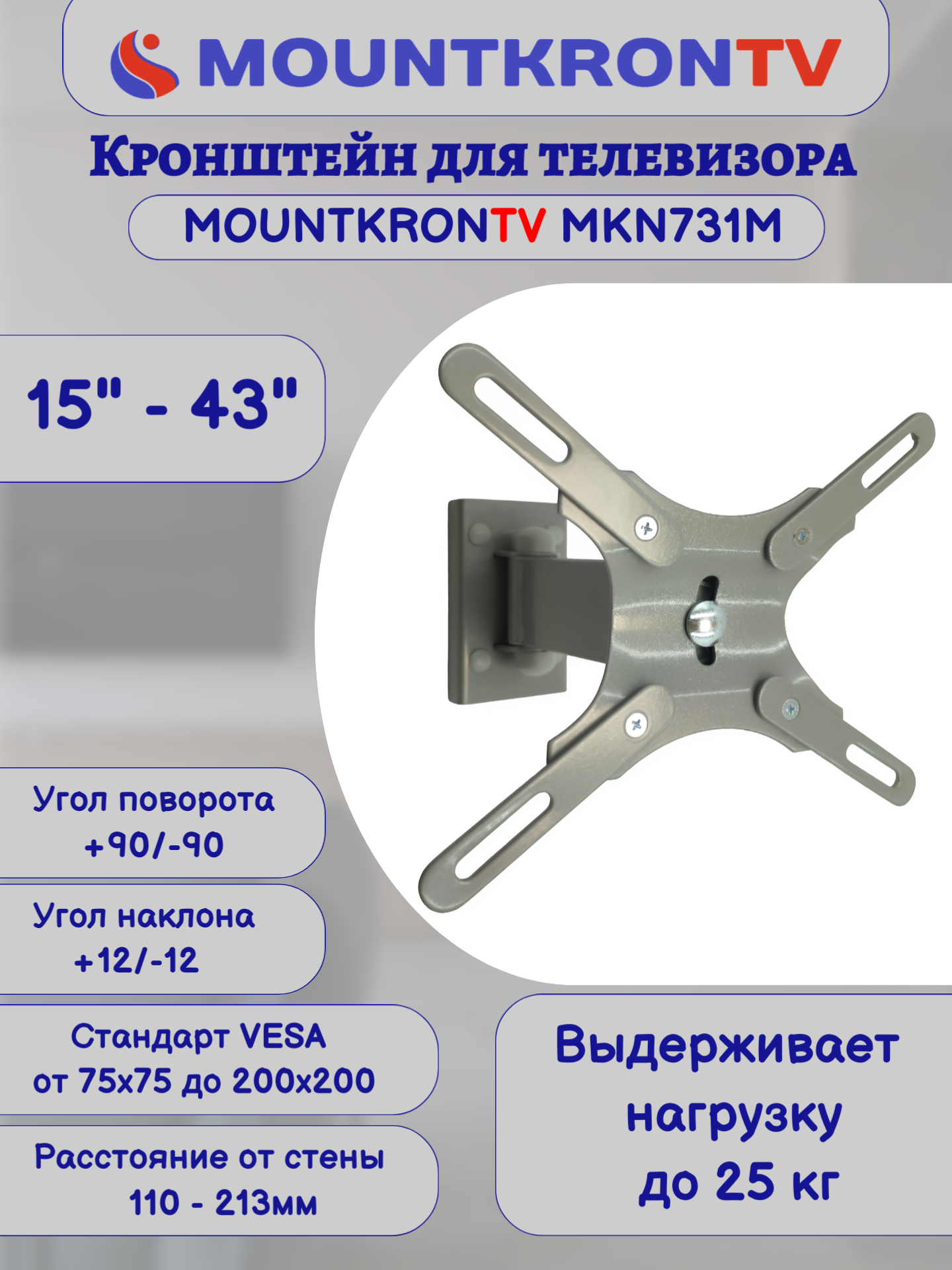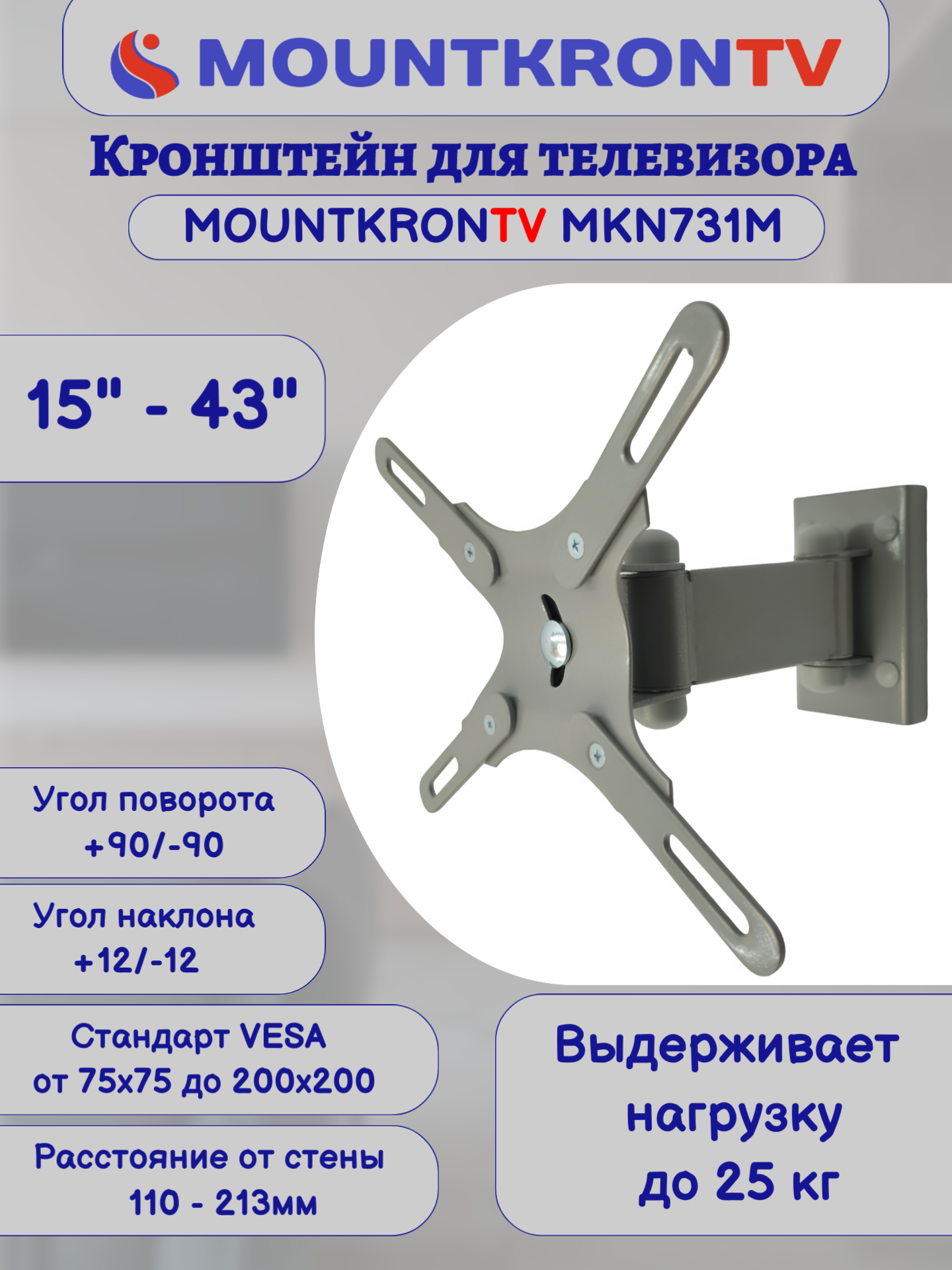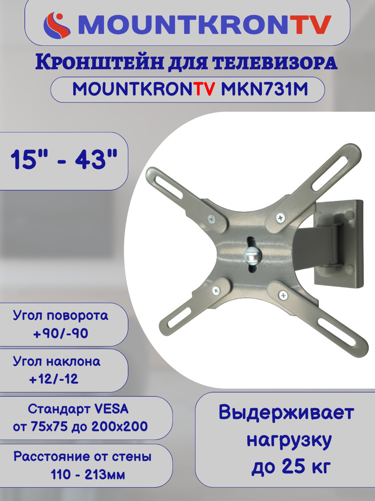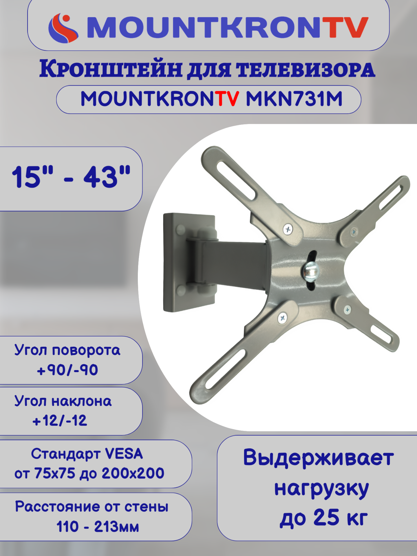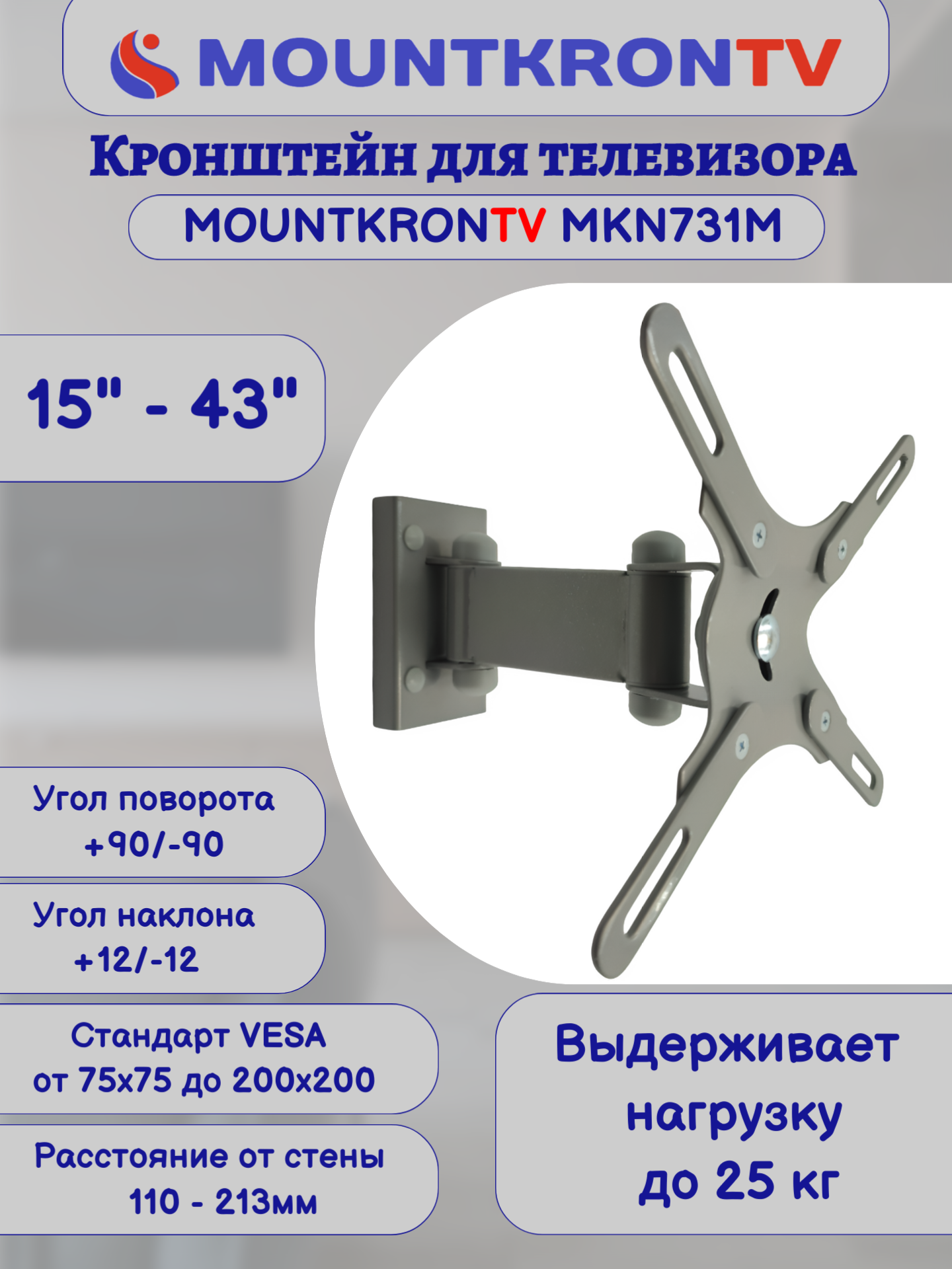 Кронштейн для телевизора MOUNTKRONTV MKN731M диагональ 15"- 43", на стену, наклонно-поворотный, серый металлик интересное: