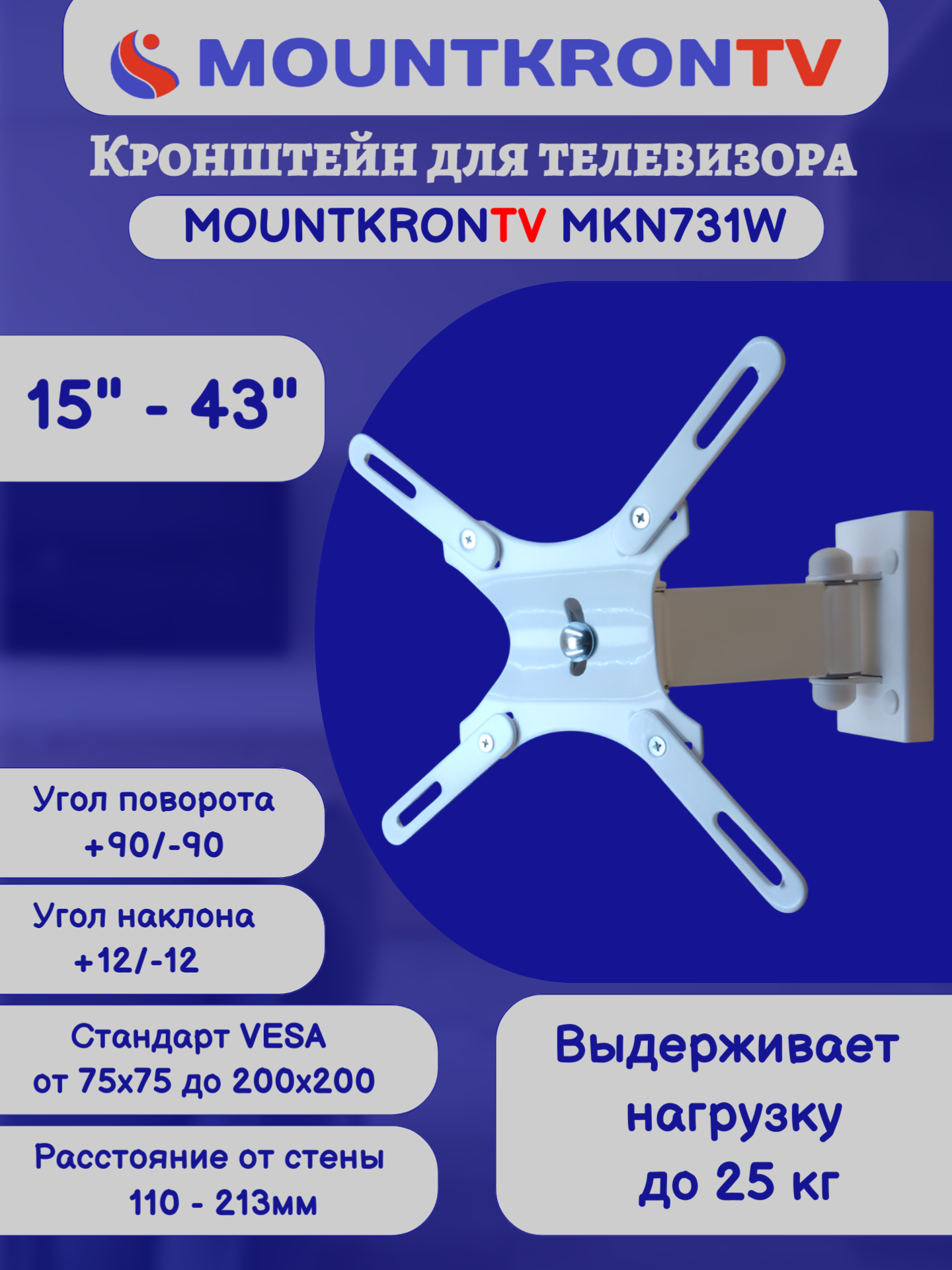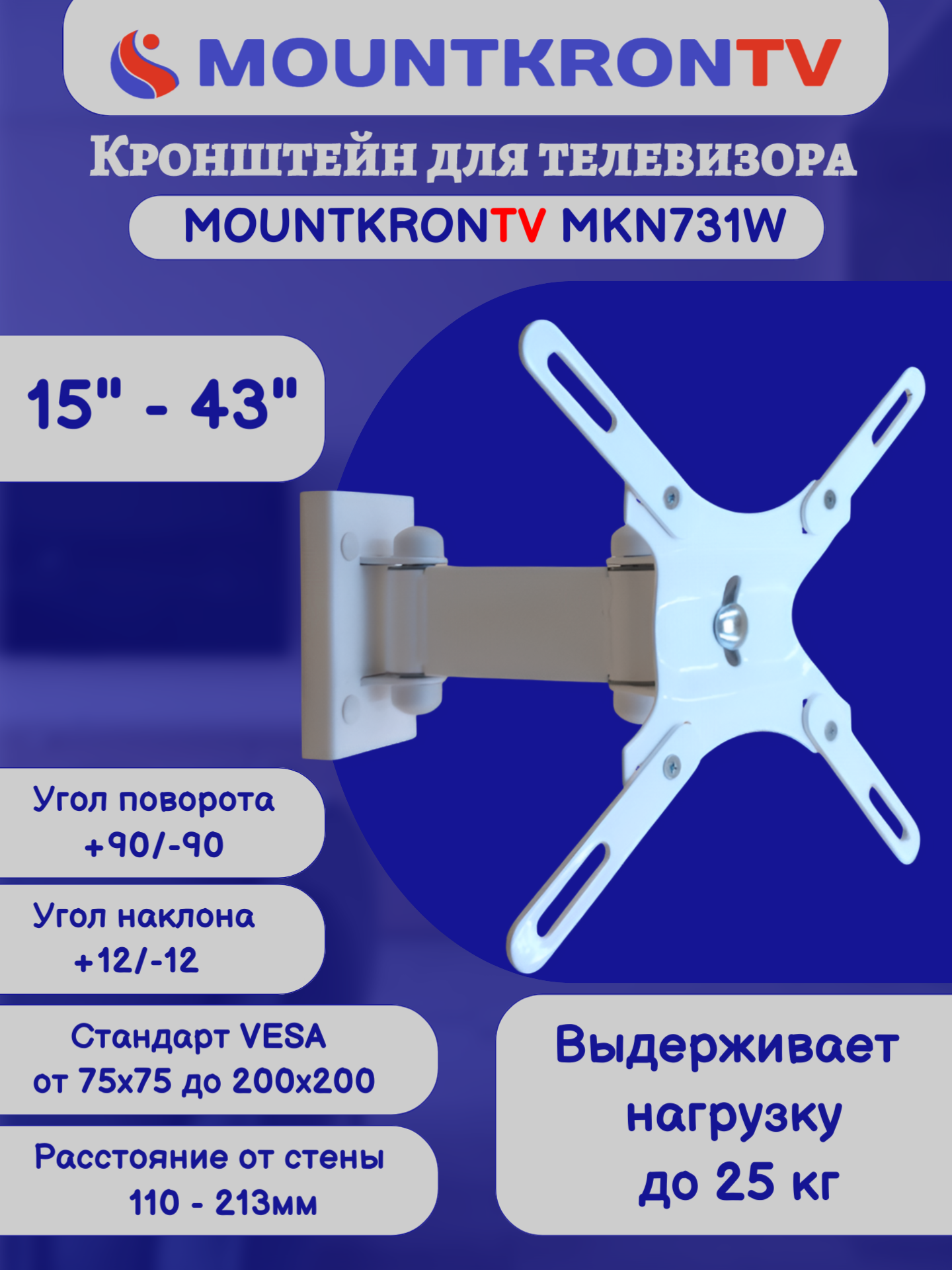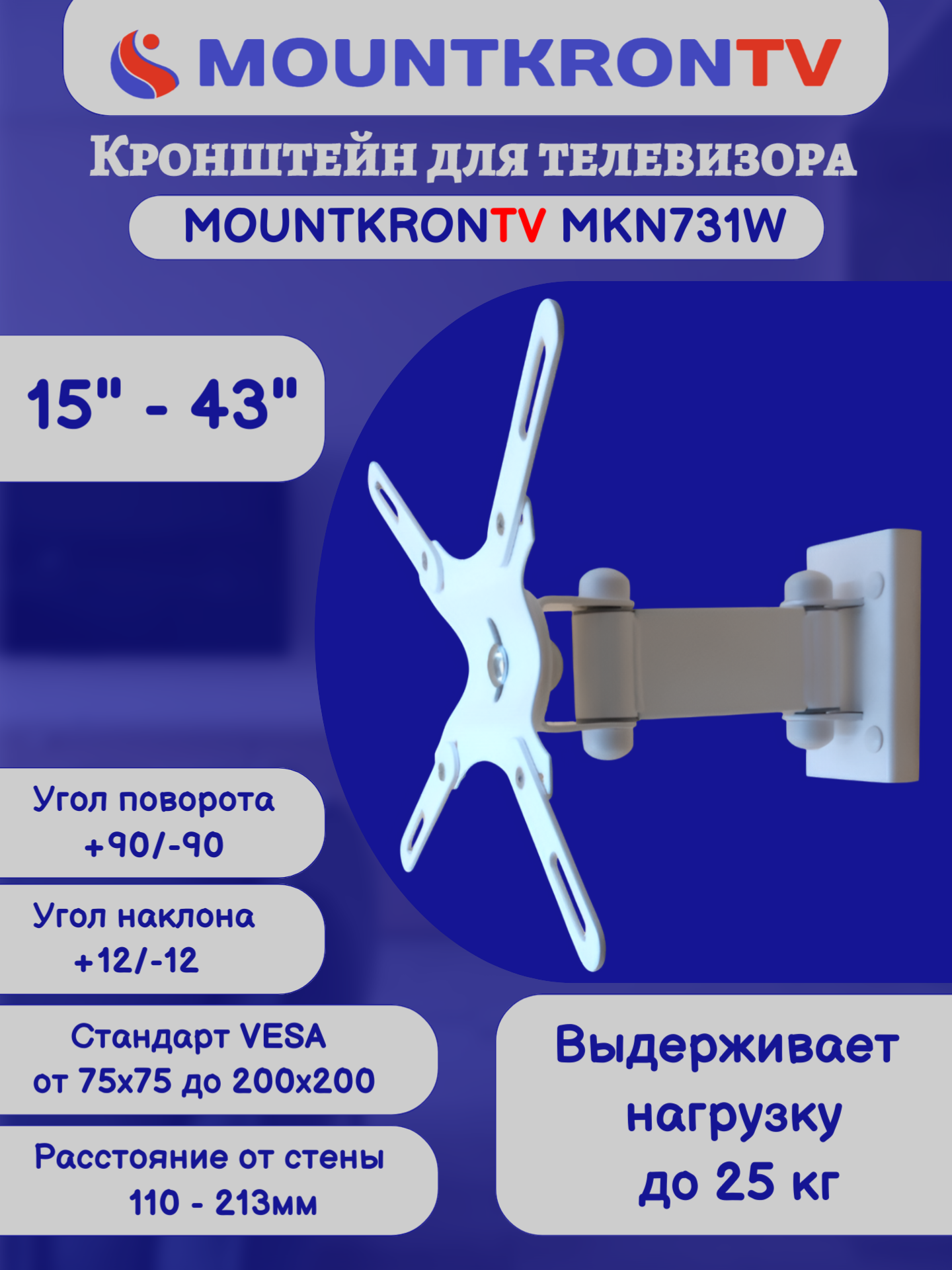 Купить Кронштейн для телевизора MOUNTKRONTV MKN731W на стену, наклонно-поворотный, диагональ 15"-43", белый