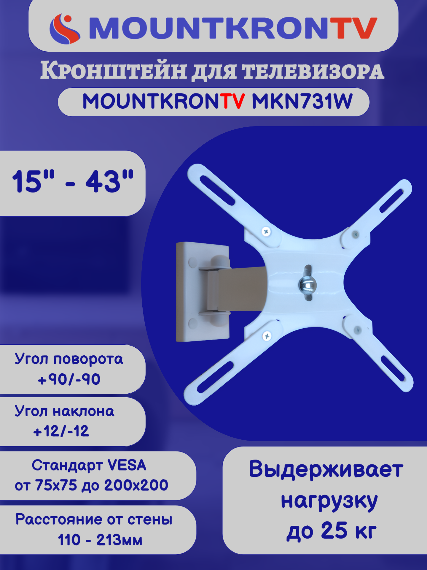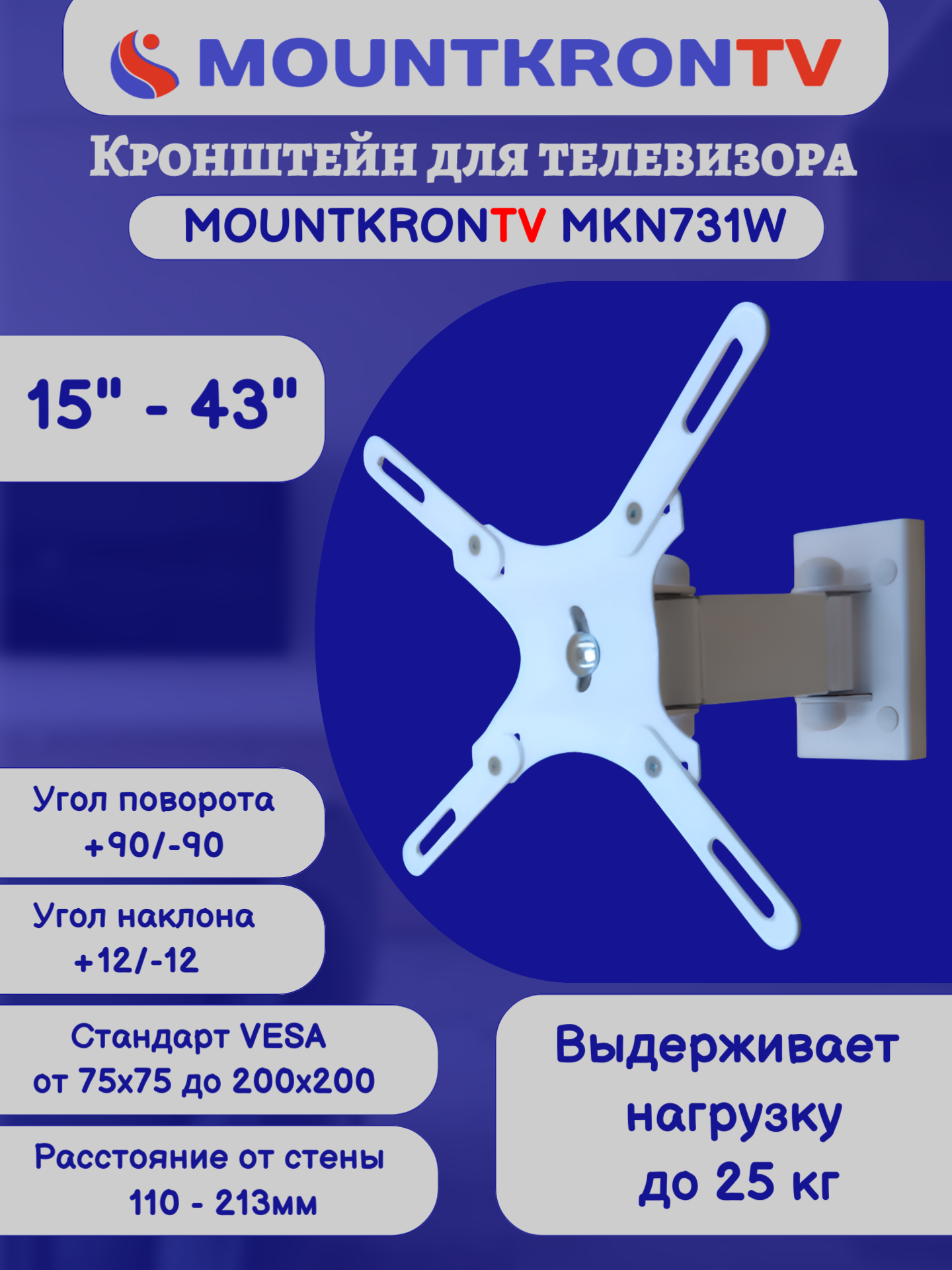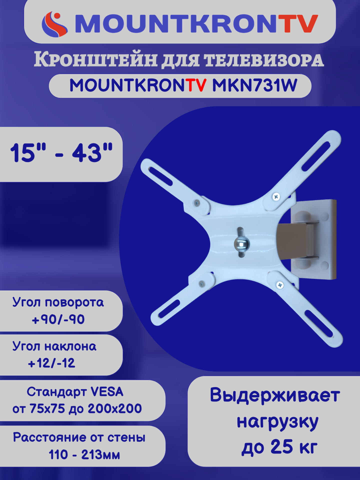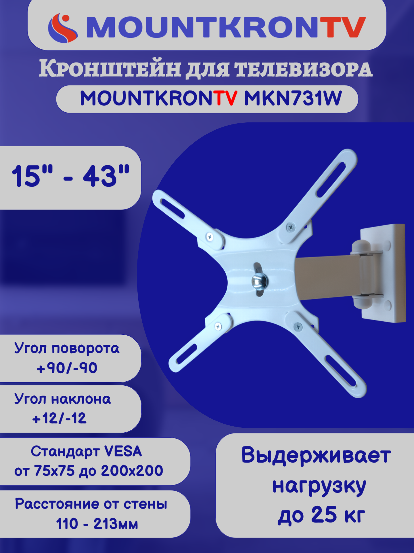 Купить Кронштейн для телевизора MOUNTKRONTV MKN731W на стену, наклонно-поворотный, диагональ 15"-43", белый