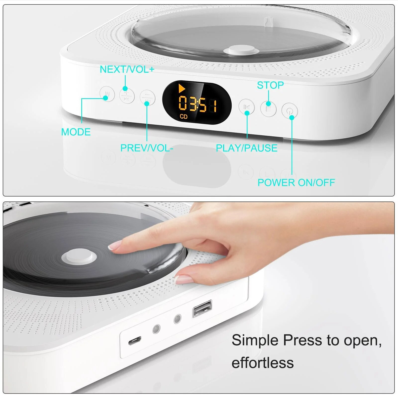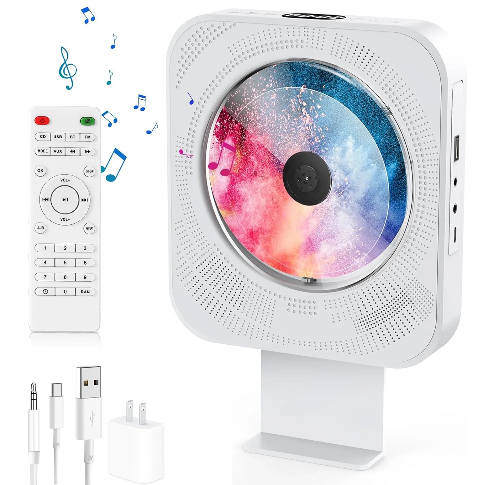 CD-плеер с динамиками Hi-Fi, Bluetooth-плеером, USB-портом/FM-радио/разъемом Aux, компактный белый CD-плеер для дома интересное: