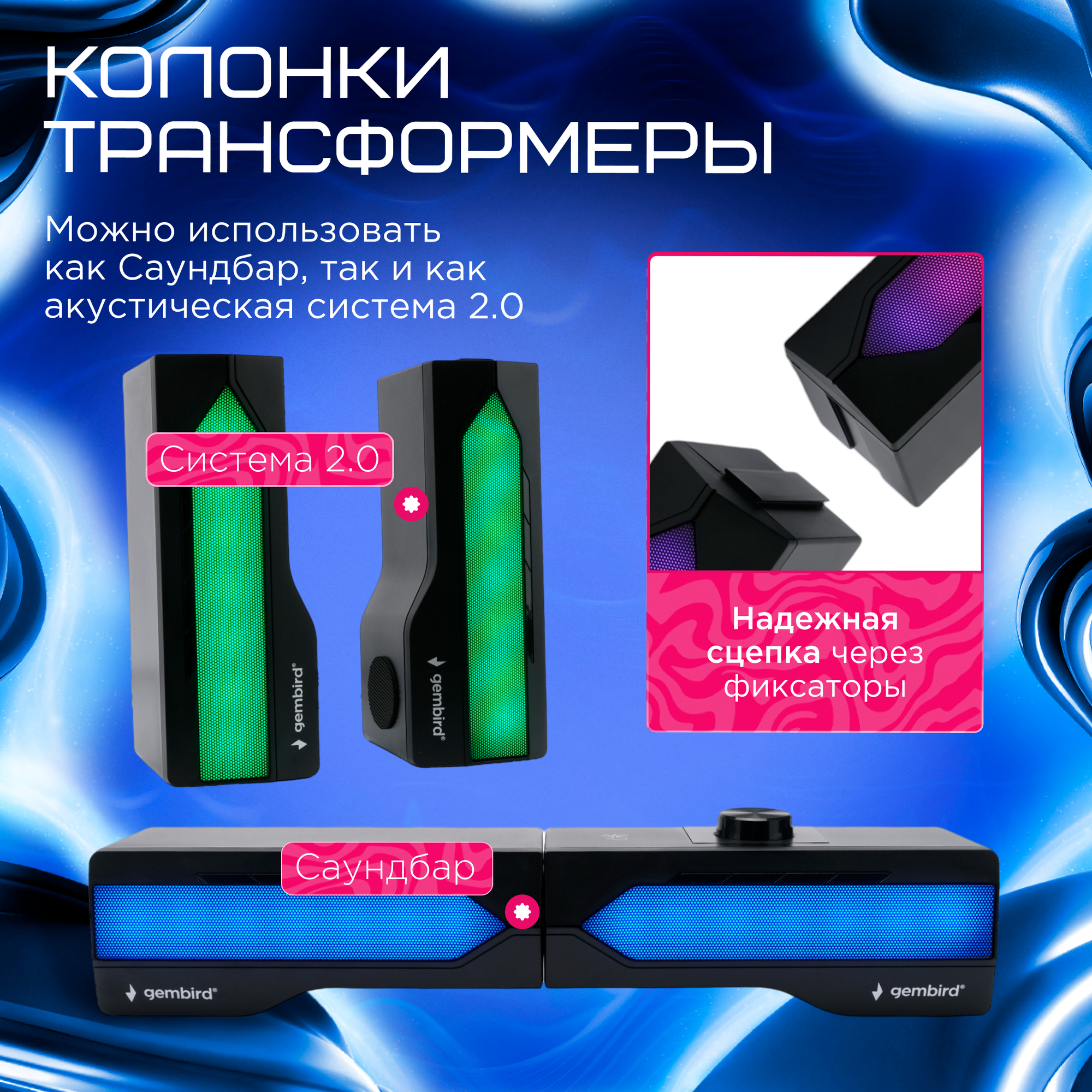 Акустическая система-трансформер 2.0 Gembird черный 10Вт пластик RGB подсветка SPK-610
