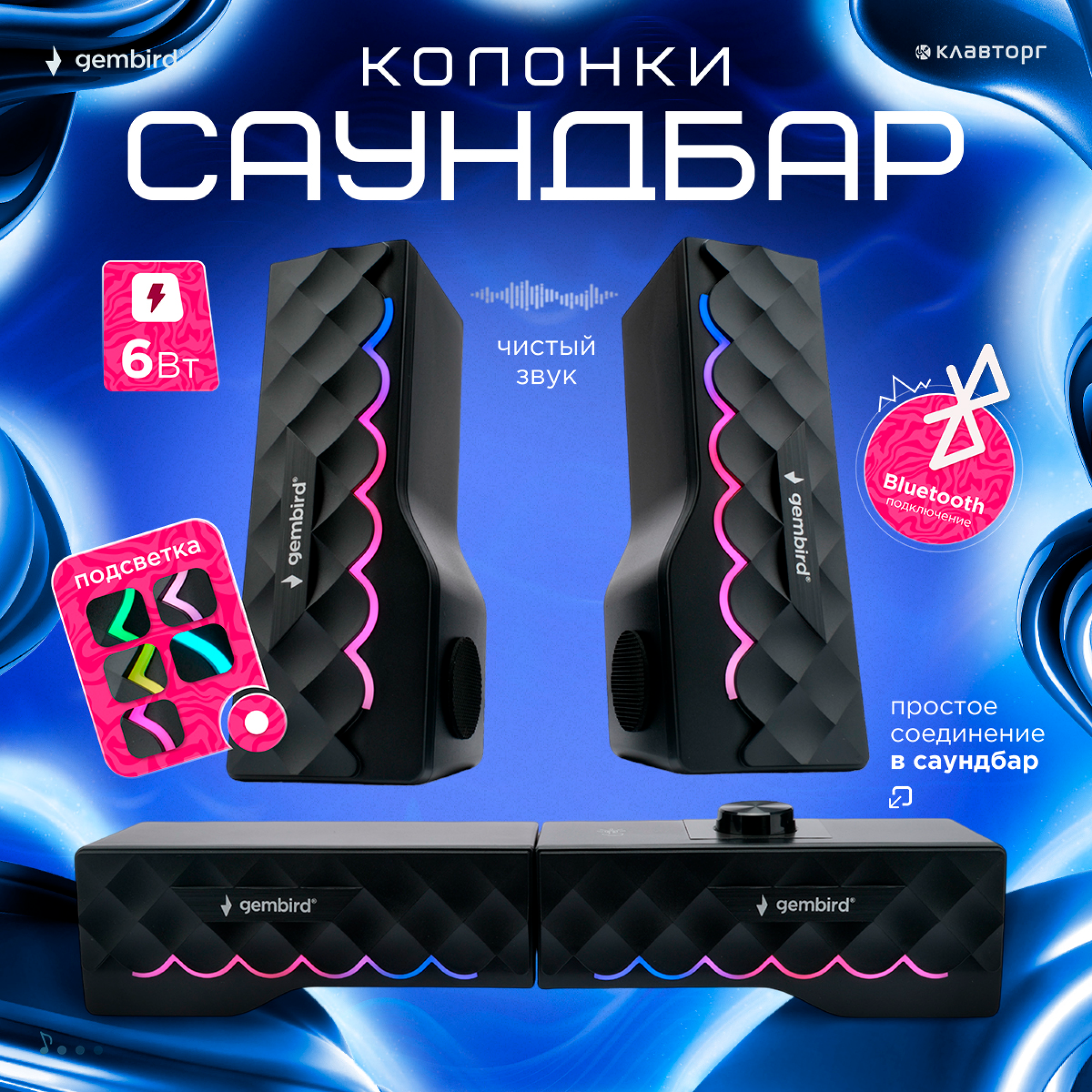Ниже Вы можете прочитать отзывы на Акустическая система-трансформер 2.0 Gembird черная 6Вт с RGB подсветкой SPK-605, ознакомится с подробными характеристиками, посмотреть интересные обзоры и фотографии на Акустическая система-трансформер 2.0 Gembird черная 6Вт с RGB подсветкой SPK-605.
