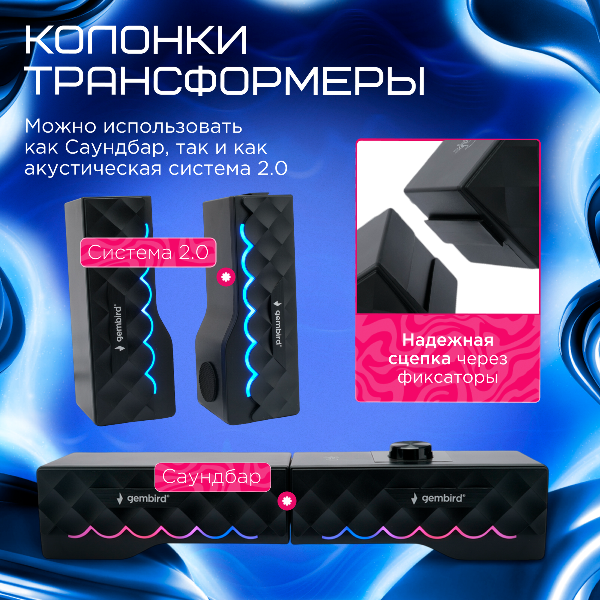 Акустическая система-трансформер 2.0 Gembird черная 6Вт с RGB подсветкой SPK-605 интересное: