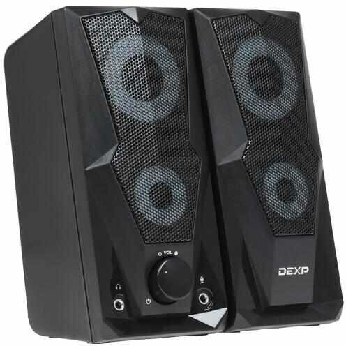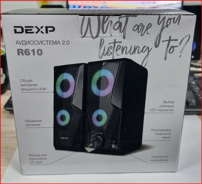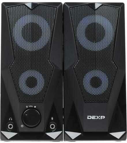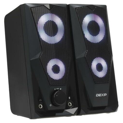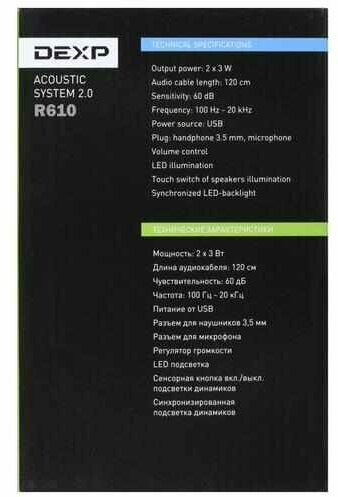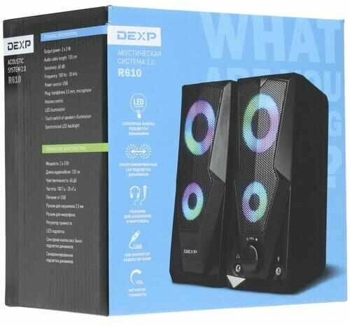 Колонки 2.0 DEXP R610бб, 6 ВТ, RGB-подсветка, сенсорная кнопка вкл/выкл подсветки динамиков интересное: