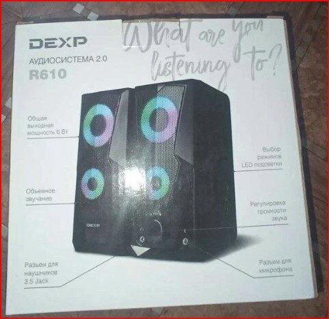 Ниже Вы можете прочитать отзывы на Колонки 2.0 DEXP R610бб, 6 ВТ, RGB-подсветка, сенсорная кнопка вкл/выкл подсветки динамиков, ознакомится с подробными характеристиками, посмотреть интересные обзоры и фотографии на Колонки 2.0 DEXP R610бб, 6 ВТ, RGB-подсветка, сенсорная кнопка вкл/выкл подсветки динамиков.