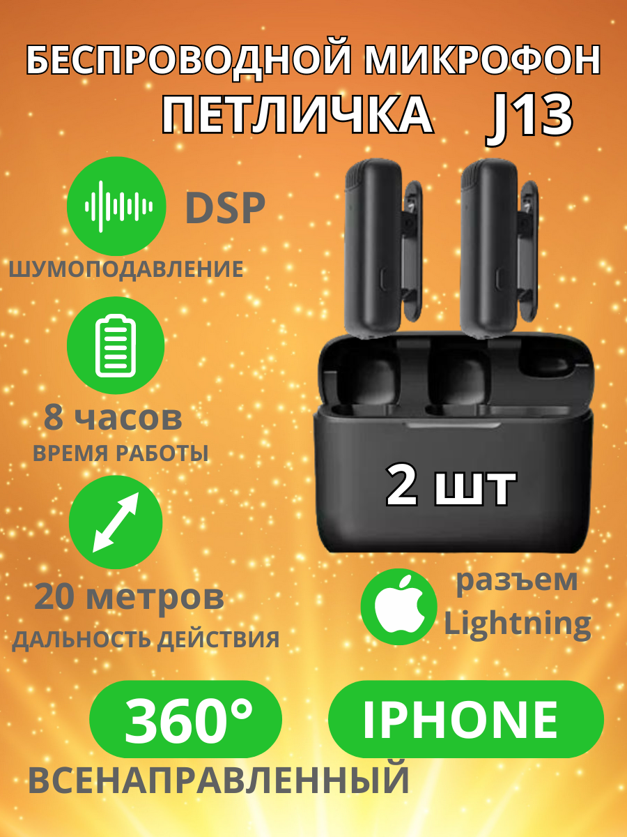 Микрофон петличный беспроводной, с шумоподавлением, петличка, для мобильного телефона, разъем Lightning, для Iphone, черный, 2шт
