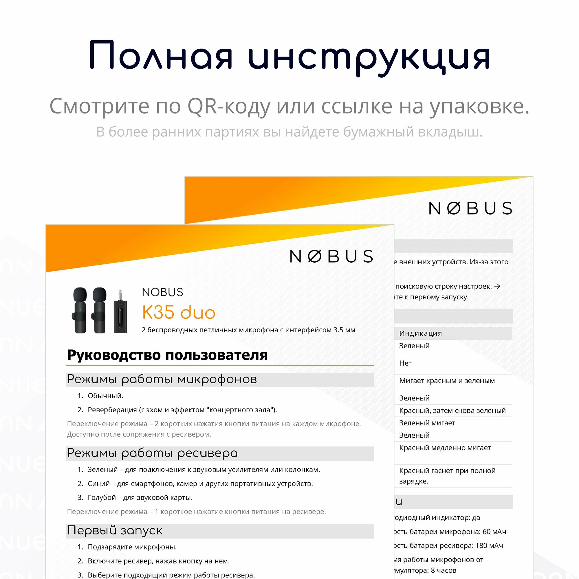 СохранитьКомплект из 2 беспроводных петличных микрофонов NOBUS K35 duo с интерфейсом 3.5 мм и шумоподавлением, черные интересное: