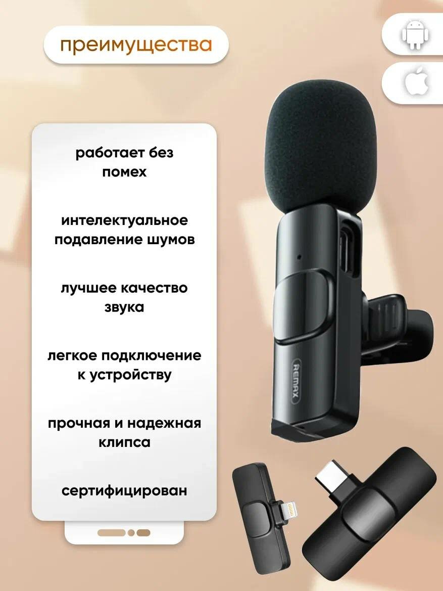 Микрофон петличный беспроводной, с шумоподавлением, петличка, для мобильного телефона, разъем Lightning, для Iphone, черный, 2шт