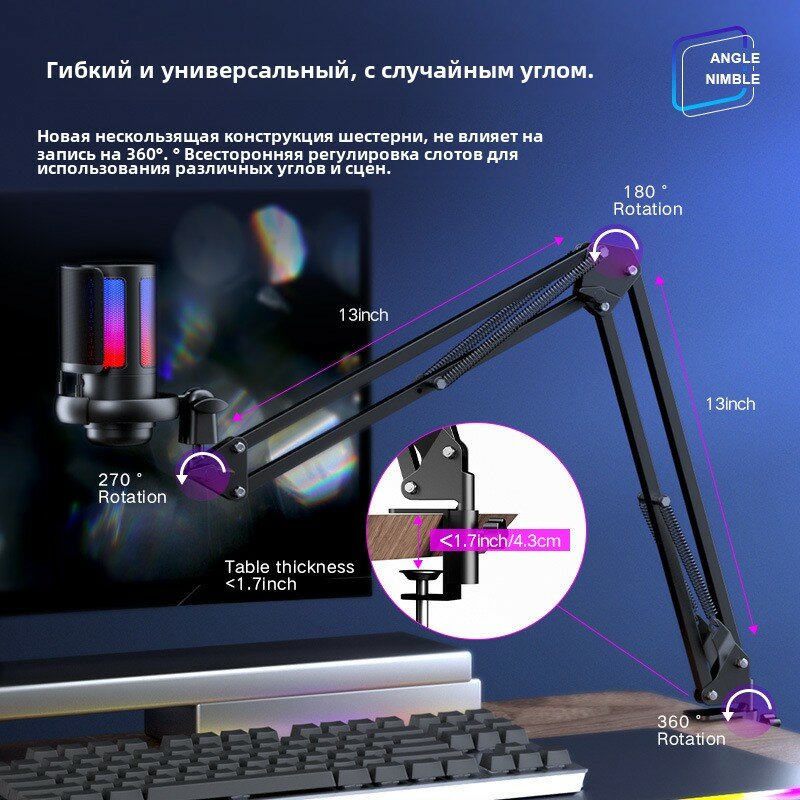 Студийный USB микрофон с RGB-подсветкой и держателем – для компьютера и ПК, стримов, записи, Zoom и OBS интересное: