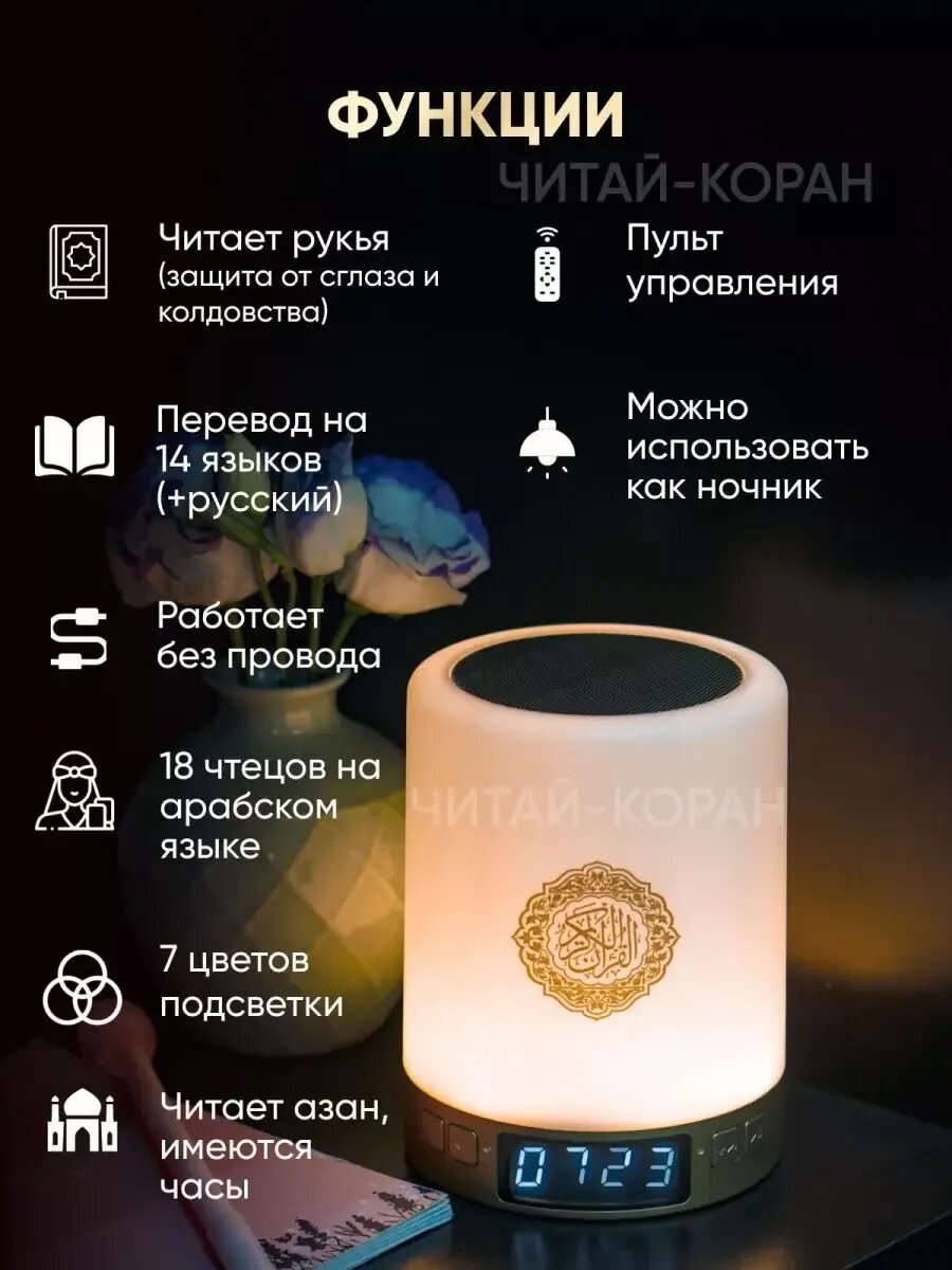 Ночник лампа читающая Коран с часами - колонка с пультом интересное: