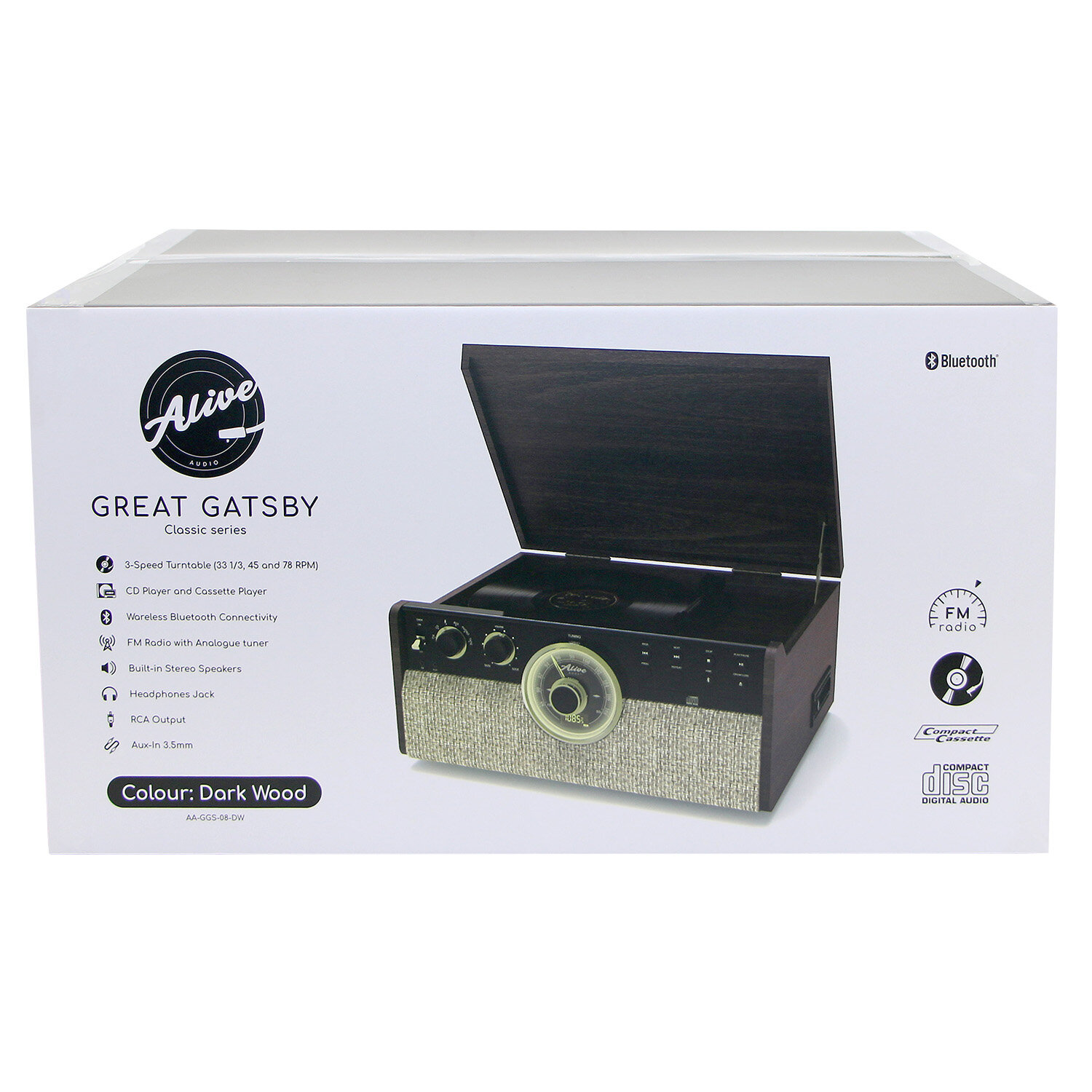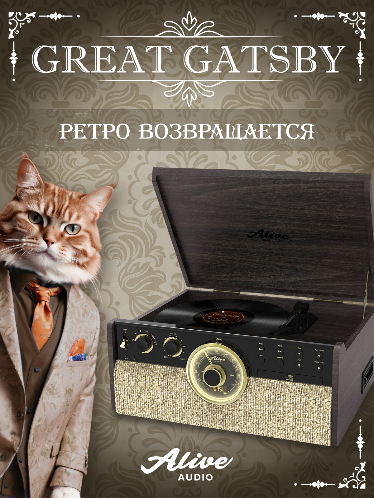 Виниловый проигрыватель Alive Audio Great Gatsby Dark Wood (CD, FM-радио, кассетник, Bluetooth, встр интересное: