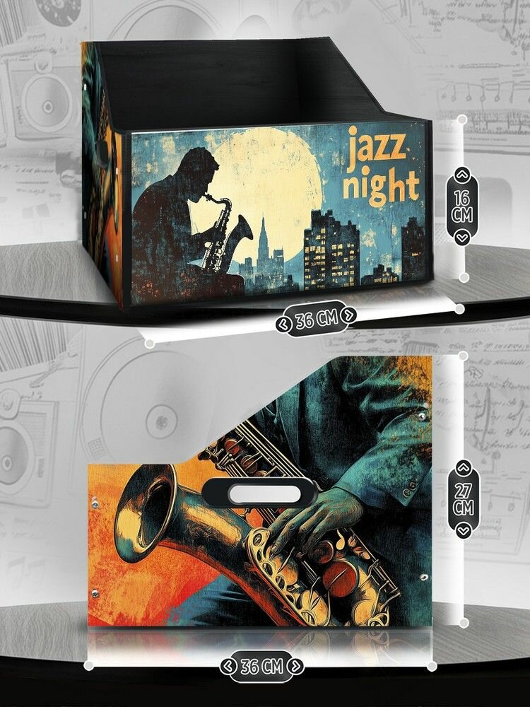 СохранитьПодставка (ящик, органайзер) для хранения виниловых пластинок с принтом "Музыка jazz night (джаз саксофон, соул, винтаж, реттро, нуар) - 425032" интересное: