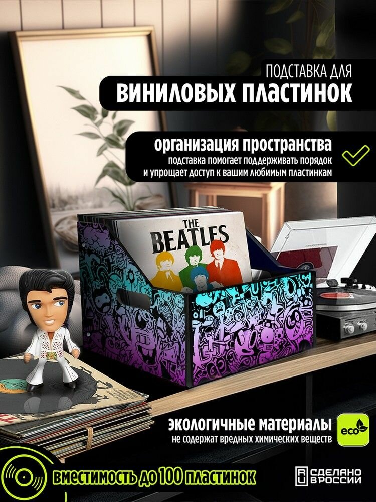 Подставка (ящик, органайзер) для хранения виниловых пластинок с принтом "эстетика Музыка (ноты, фанк, пластинки) - 52504005"