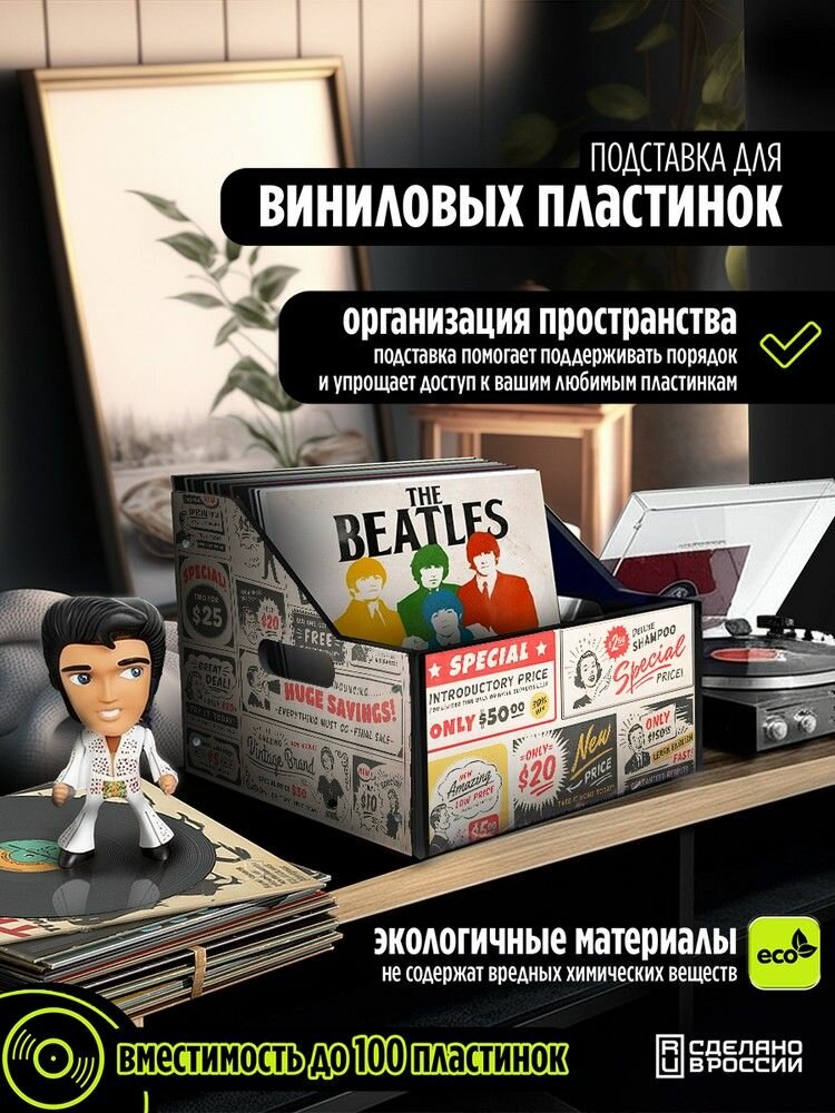 СохранитьПодставка (ящик, органайзер) для хранения виниловых пластинок с принтом "Эстетика Ретро (Газета, винтаж, виниловая пластинка) - 62503402" интересное: