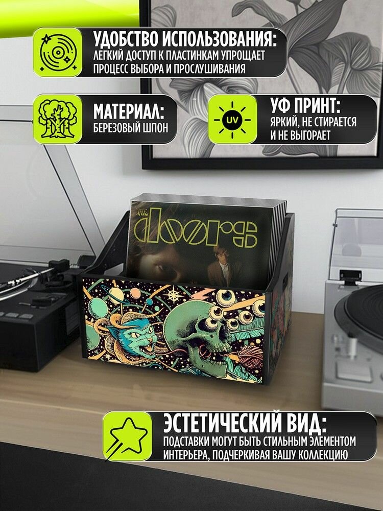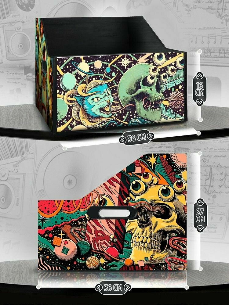 СохранитьПодставка (ящик, органайзер) для хранения виниловых пластинок с принтом "эстетика Психоделика (черепа, космос, кот, щупальца осьминога, геометрия, звезды, винтаж) - 52504007" интересное: