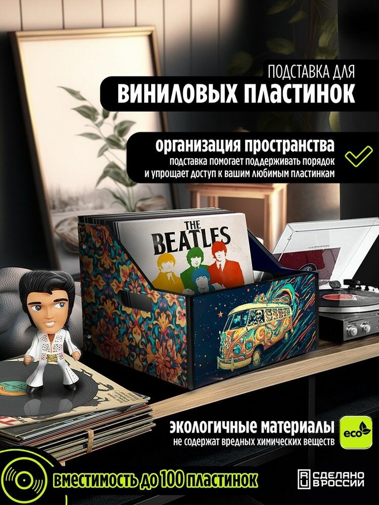 СохранитьПодставка (ящик, органайзер) для хранения виниловых пластинок с принтом "Разное Космос (психоделика, ретро автобус, цветы, скелет ) - 425036" интересное: