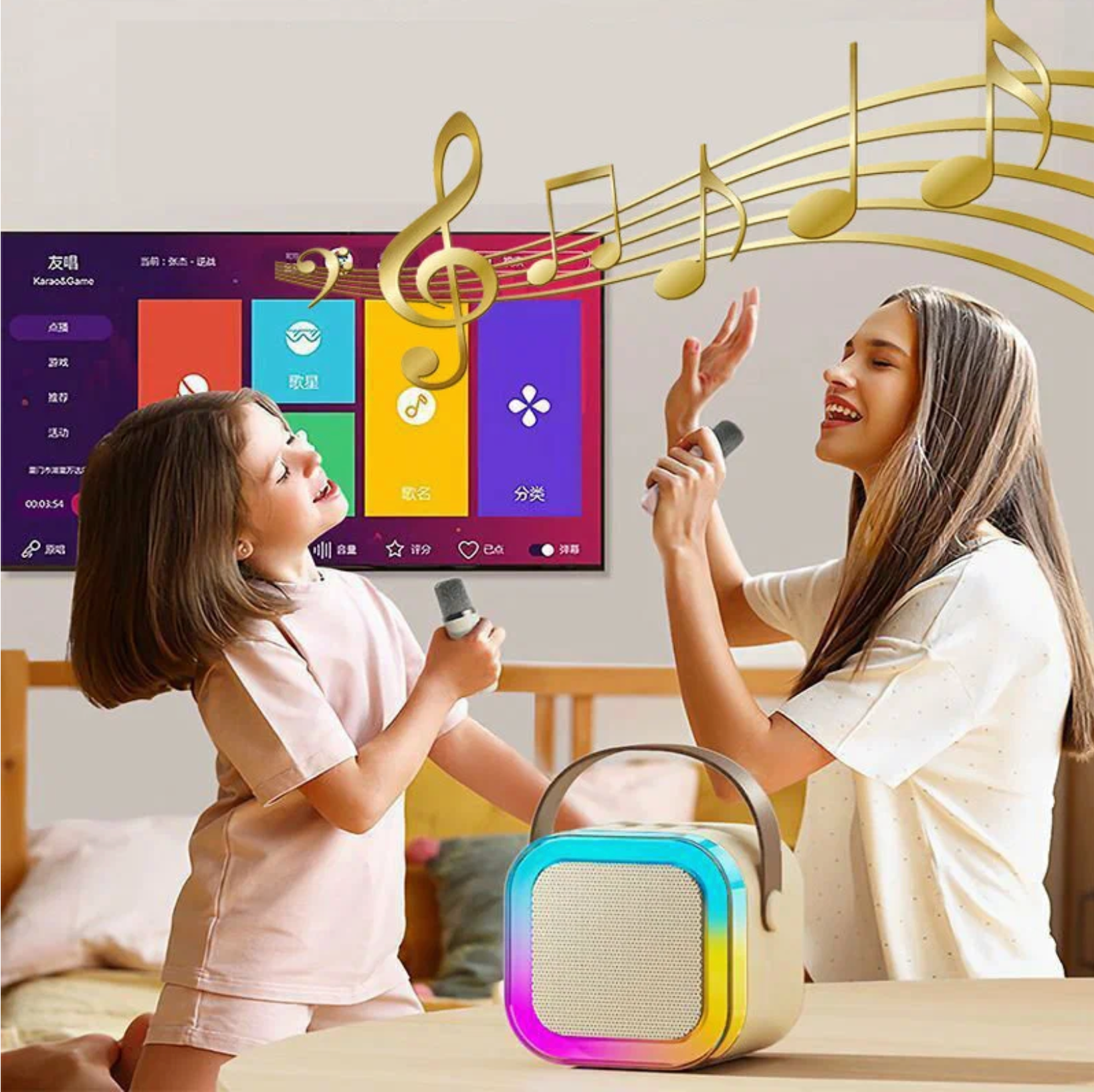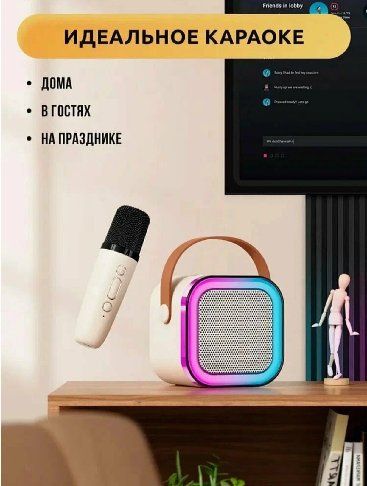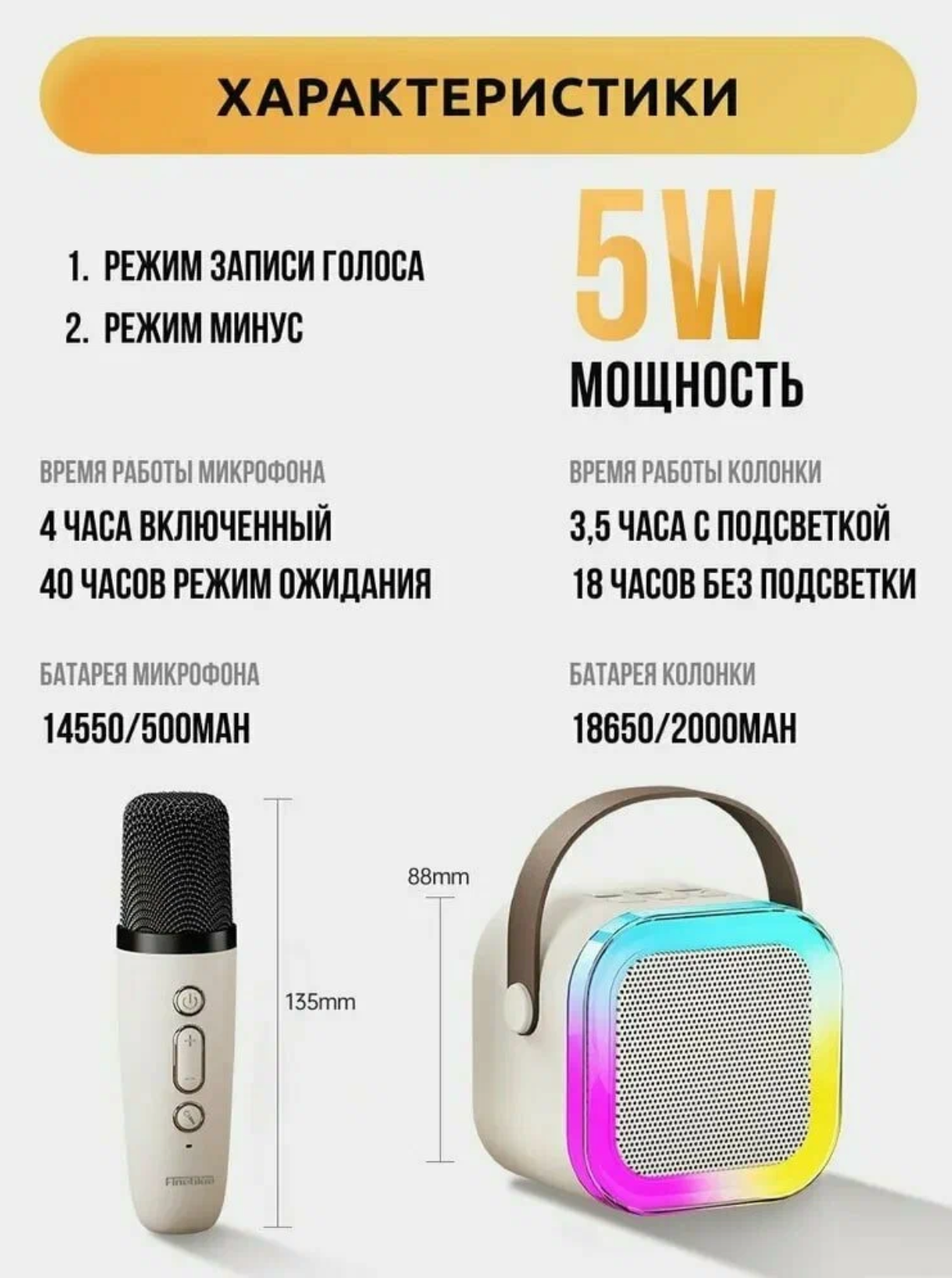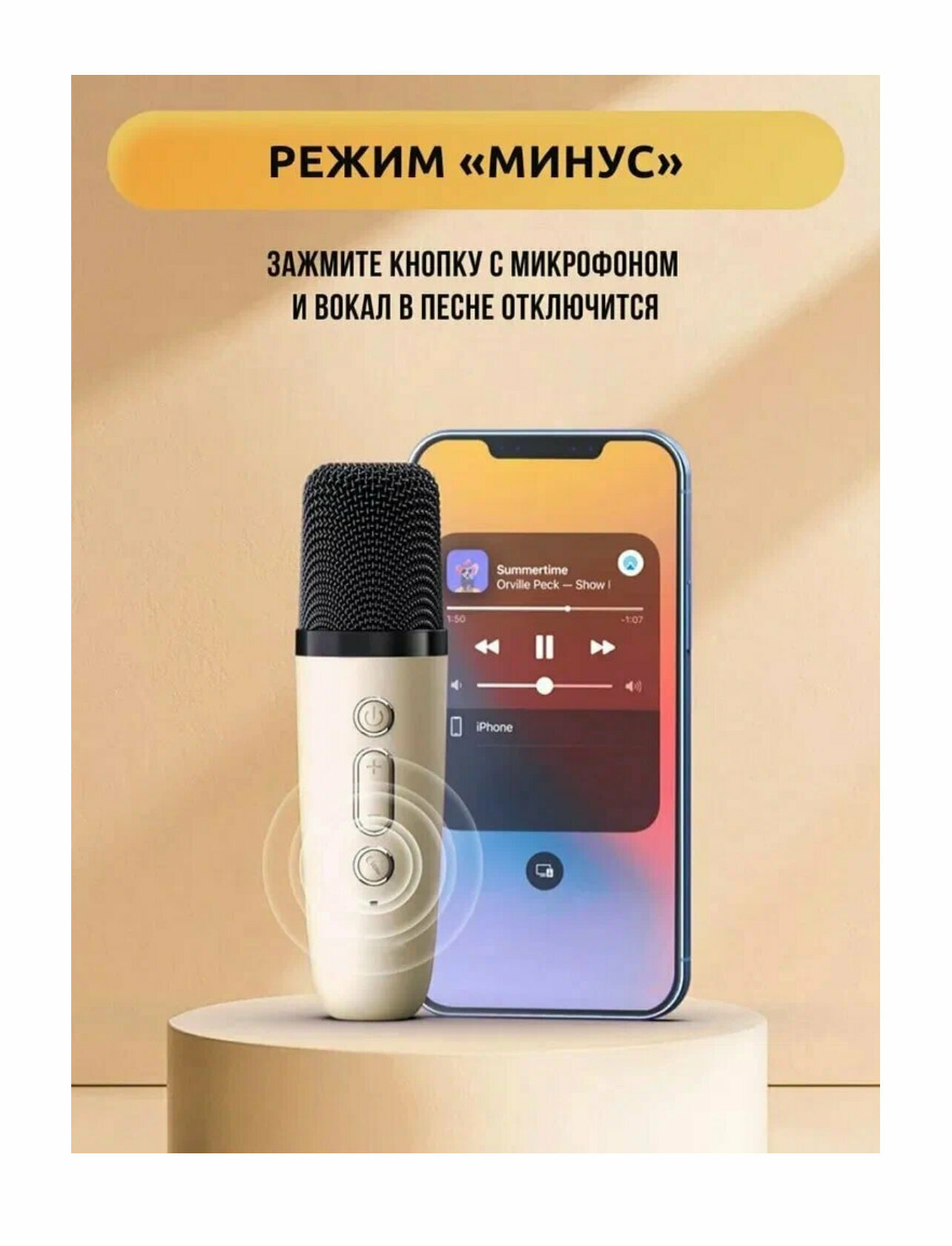 Детская караоке система/Караоке система с двумя беспроводными микрофонами и колонкой/(Беспроводной, Живой вокал, Портативная колонка) бежевый интересное: