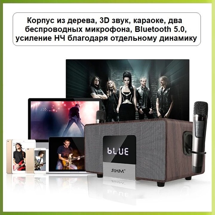 RHM RM-K222 (White) - мощная BT-колонка + караоке, Opt/Line, SW, ДУ, 200 Вт (RMS), дерево интересное: