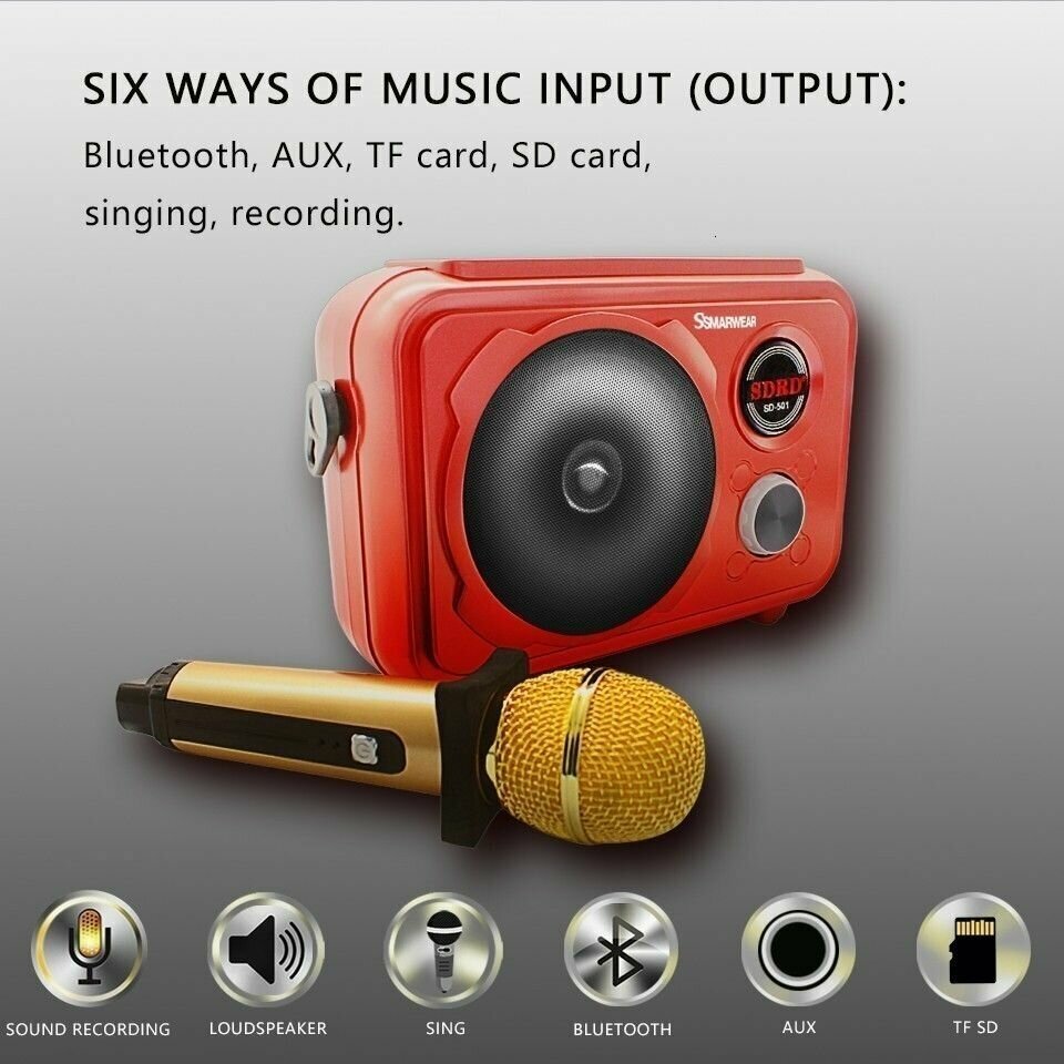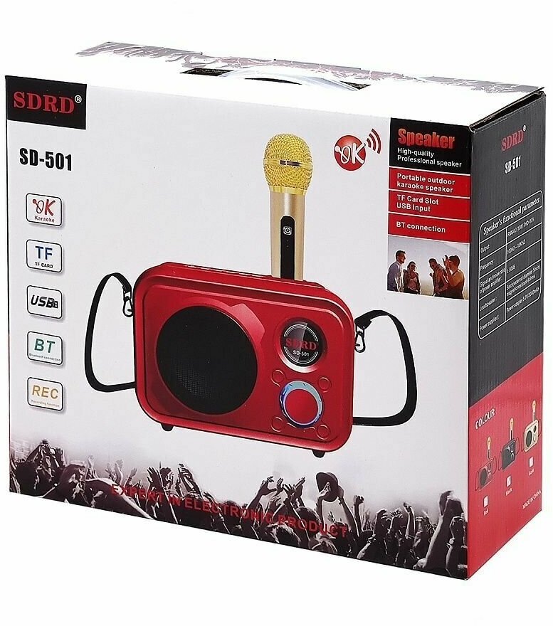 Ниже Вы можете прочитать отзывы на Караоке система SDRD SD-501 золотистая Bluetooth, беспроводной микрофон в комплекте, ознакомится с подробными характеристиками, посмотреть интересные обзоры и фотографии на Караоке система SDRD SD-501 золотистая Bluetooth, беспроводной микрофон в комплекте.