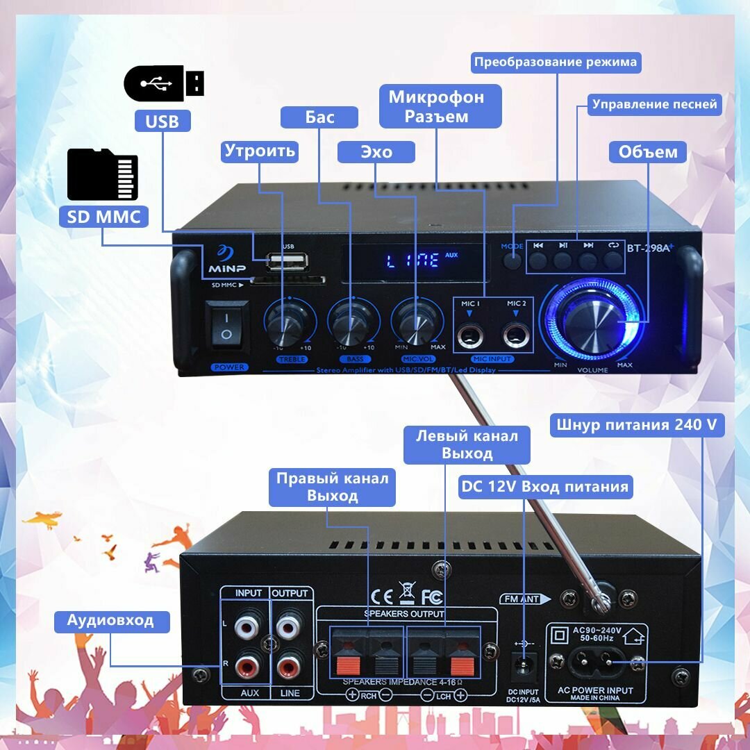 Yсилитель звука для колонок, BT298A+, усилитель для колонок, Домашний мощности, Bluetooth 5.3FM/USB/RCA,500BT+500BT интересное: