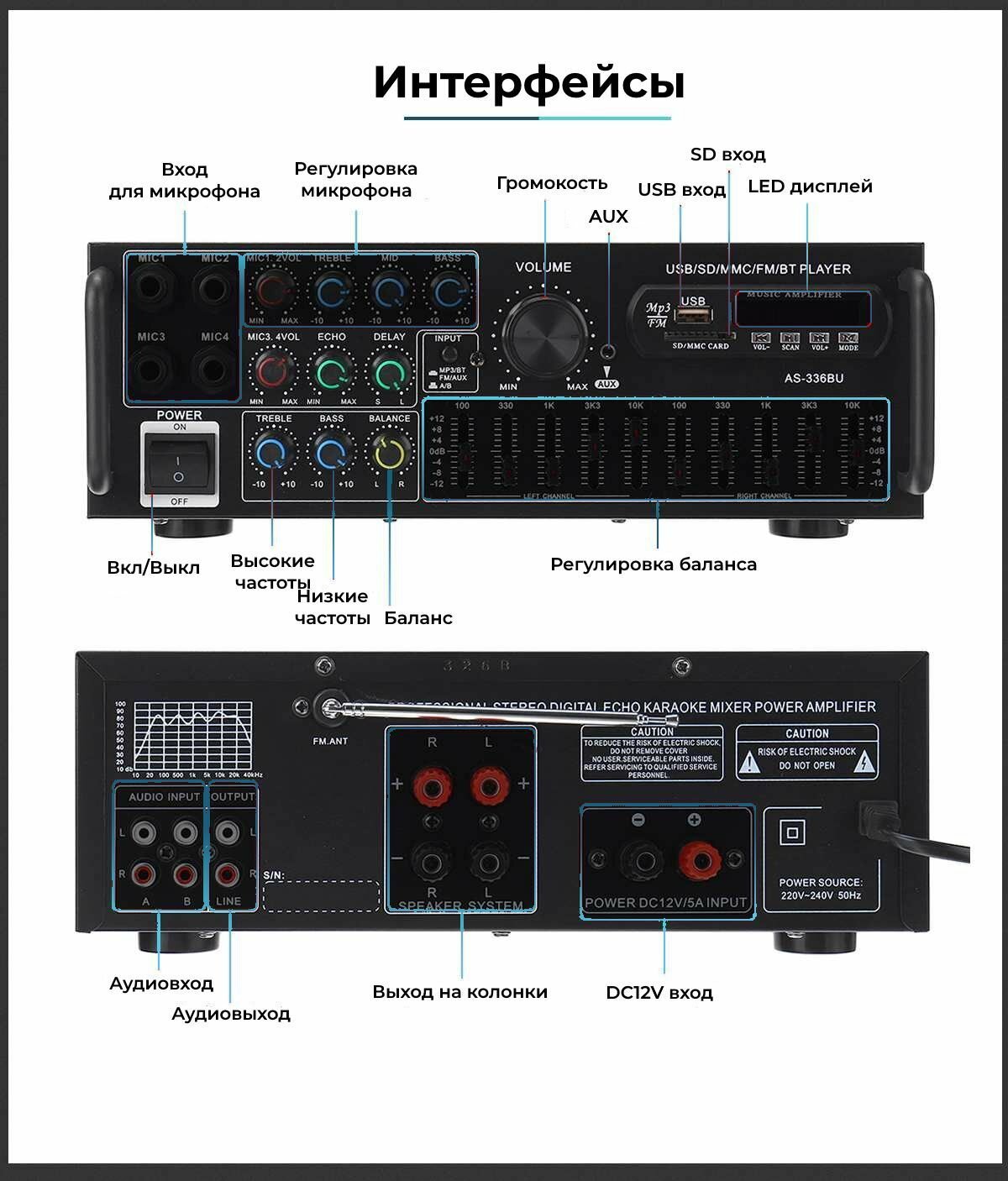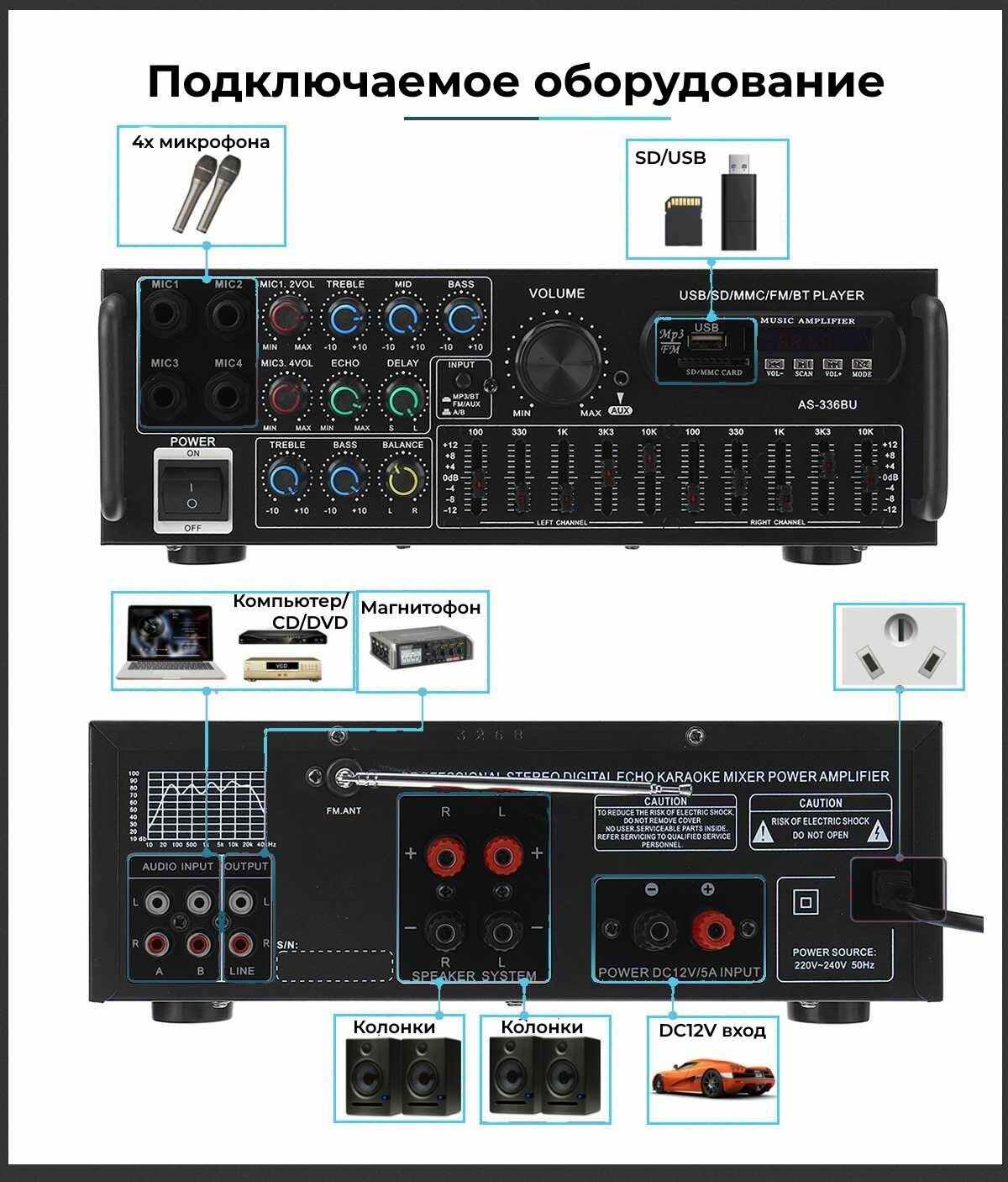 2000W AS-336BU усилитель мощности звука с блютуз для колонок интересное: