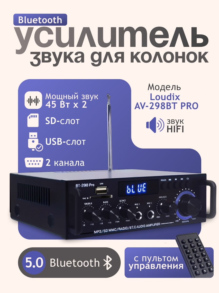 Усилитель звука для колонок Loudix AV-298BT PRO, 2-х канальный, Bluetooth 5.0, 45 Вт + 45 Вт интересное: