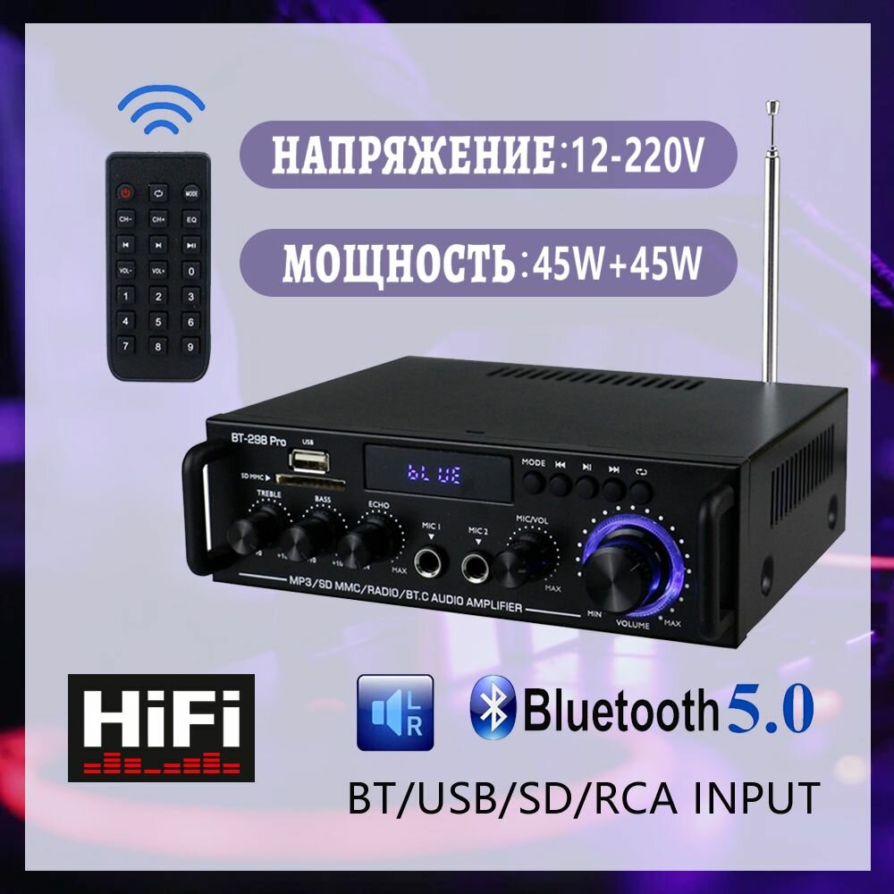 Yсилитель звука для колонок/HIFI. bt298pro, усилитель 2.1, Bluetooth5.0, FM/MIC*2/USB/TF, 500BT+500BT интересное: